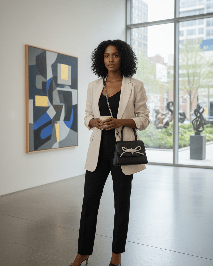 A sleek faux leather mini bag featuring a structured top handle, detachable chain strap, and a sparkling rhinestone rope bow accent. Compact, elegant, and perfect for any occasion.