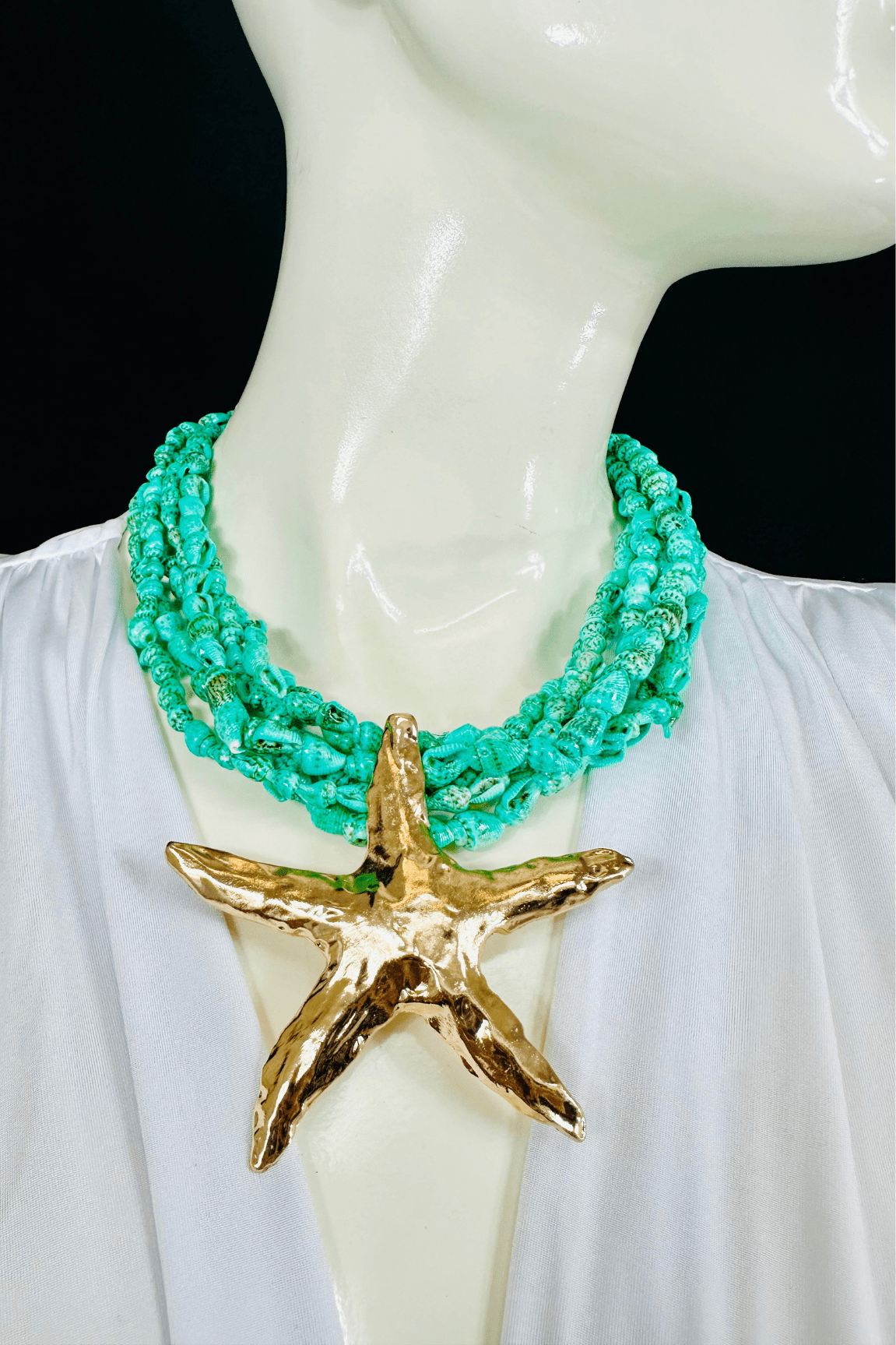 It is designed to evoke a sense of the ocean and beach vibes, with its multiple strands of small shells and a prominent starfish pendant as the focal point. The necklace is a bold and eye-catching accessory that can add a touch of seaside charm to any outfit.