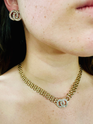 - Elevate your elegance with the Timeless Harmony Necklace Set, featuring a meticulously crafted necklace, matching bracelet, and earrings. This set showcases a sophisticated interlocking design, embellished with dazzling stones for a touch of refined luxury. Perfect for any occasion, this set adds a subtle yet striking finish to your ensemble.