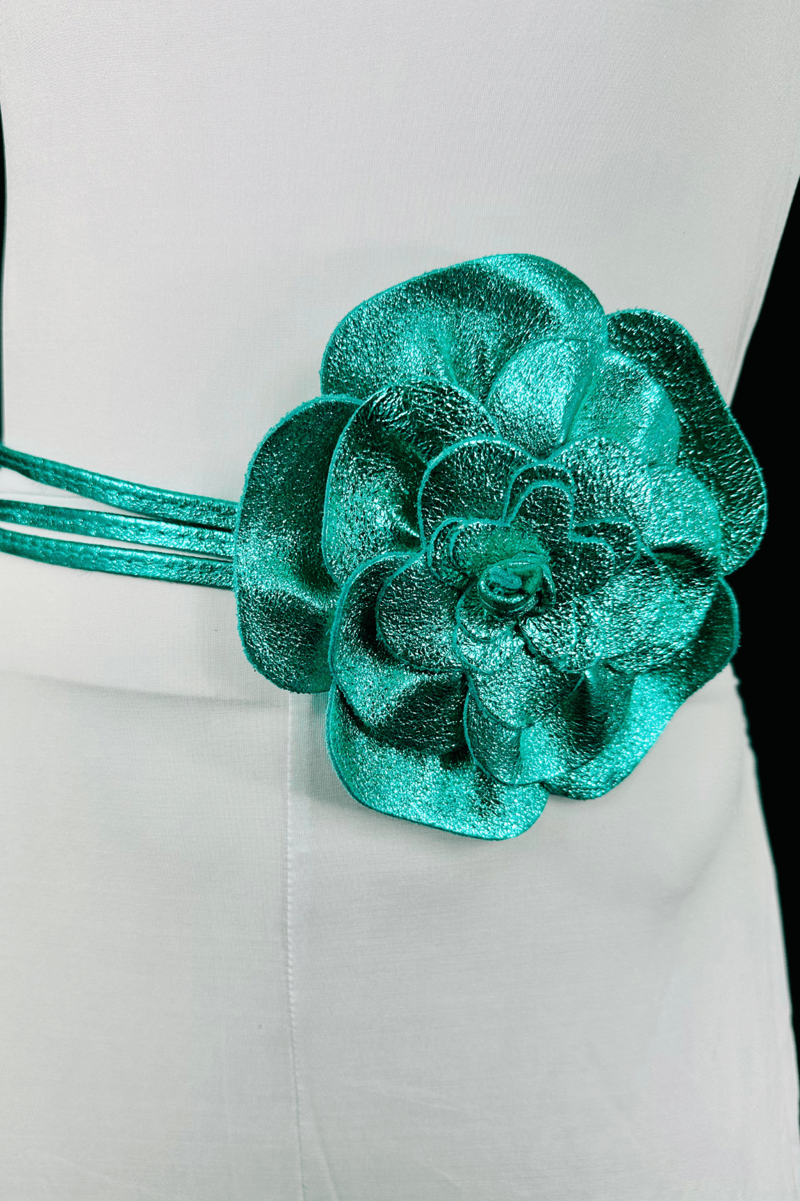 Elevate your style with this versatile accessory crafted from high-quality leather. The adjustable strap ensures a comfortable fit, while the oversized flower detail adds a stunning focal point. Convertible from a wrap belt to a choker, this piece offers multiple styling options to enhance your ensemble with sophistication and charm. Perfect for adding a touch of elegance to any outfit, the Floral Radiance Convertible Leather Wrap Belt & Choker is a must-have addition to your accessory collection.
