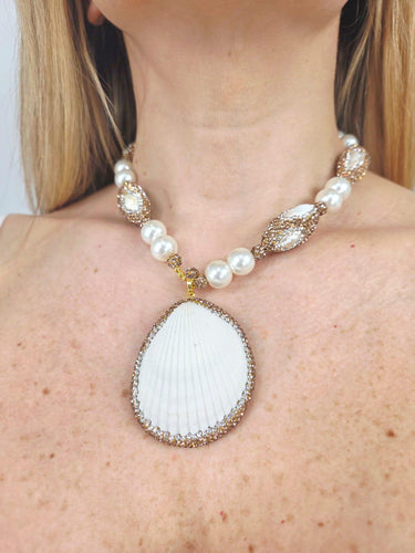 Channel timeless elegance with the Ocean Luxe Shell Necklace, a statement piece inspired by the beauty of the sea. Featuring a natural shell pendant framed in shimmering crystal details, this necklace exudes sophistication and coastal charm. The strand is adorned with luminous pearls and embellished accents, creating a stunning balance of refinement and nature-inspired allure. Whether styled for a beachside soirée or an upscale evening event, this exquisite necklace adds a touch of oceanic glamour to any outfit.