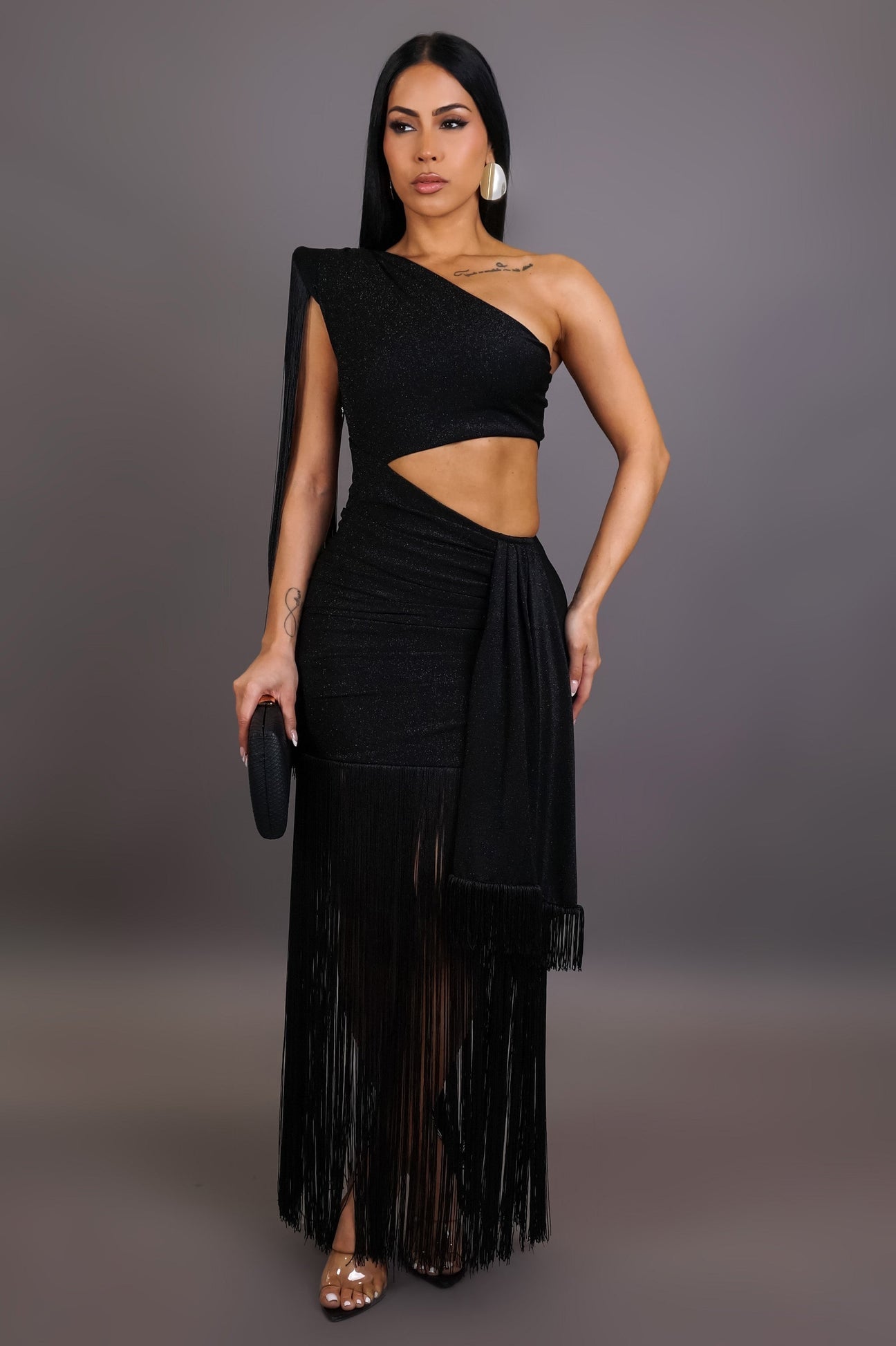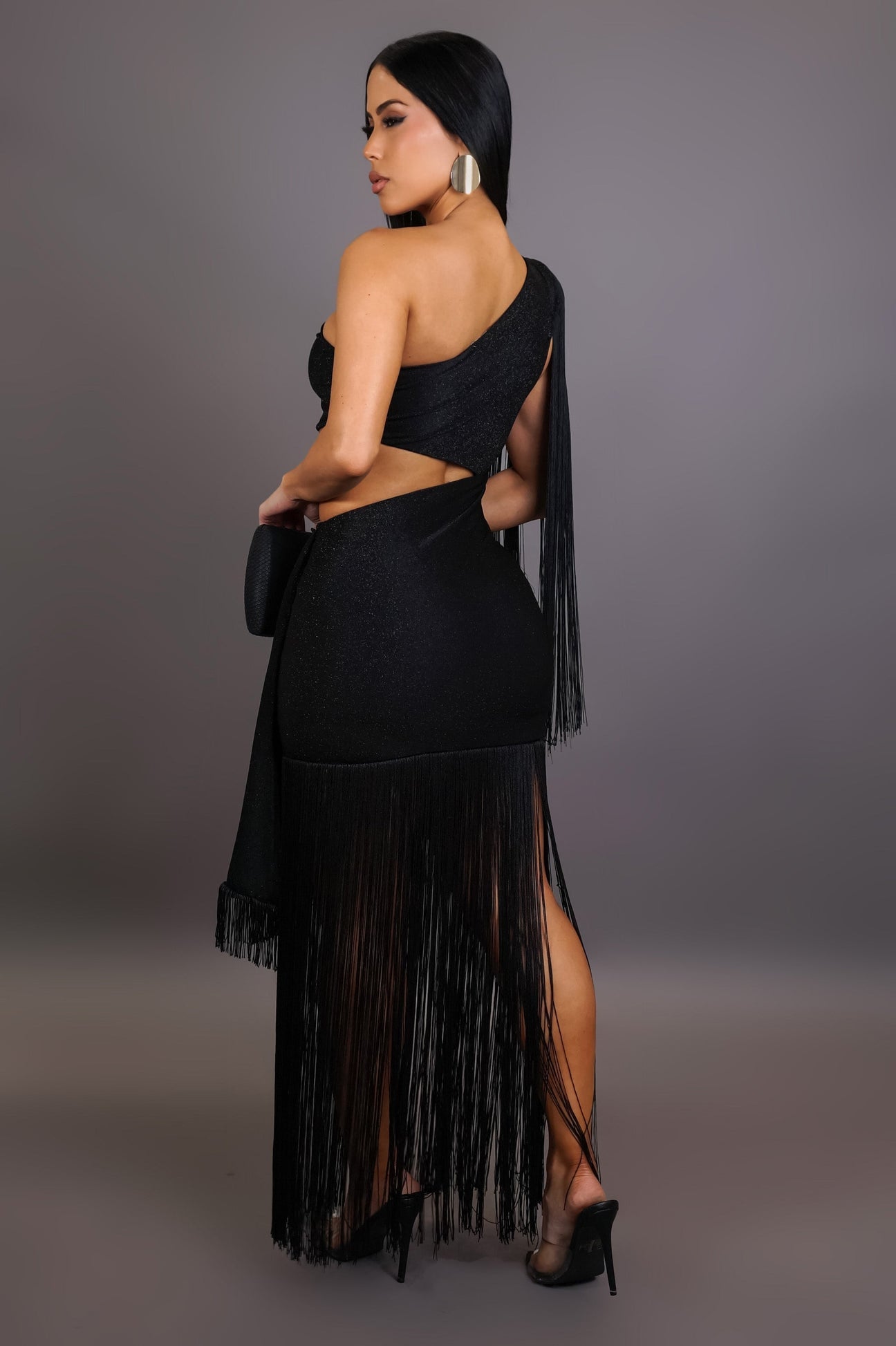 Golden Fringe Glam Cut-Out Maxi Dress - Black