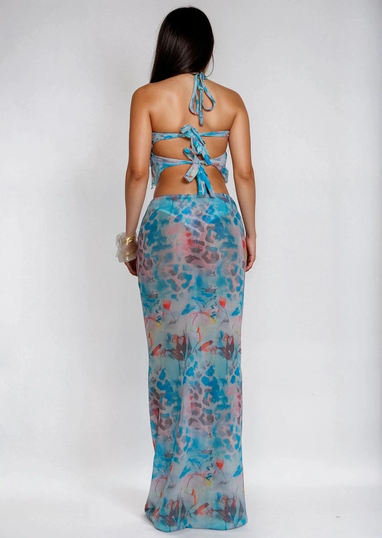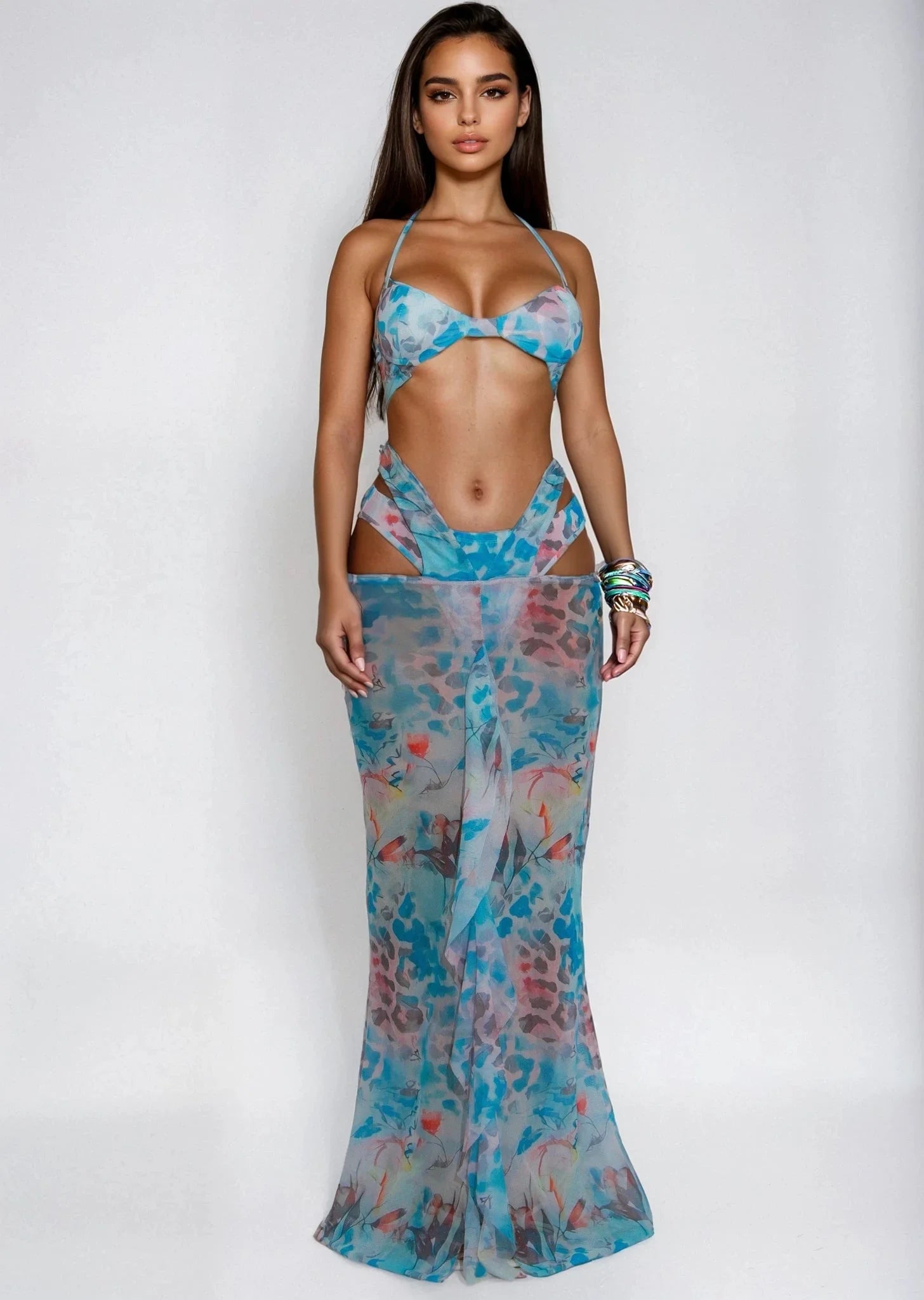 - Turn heads in this tropical-inspired 3-piece set featuring a padded halter top, high-cut bottoms, and a flowy sheer maxi skirt