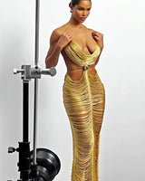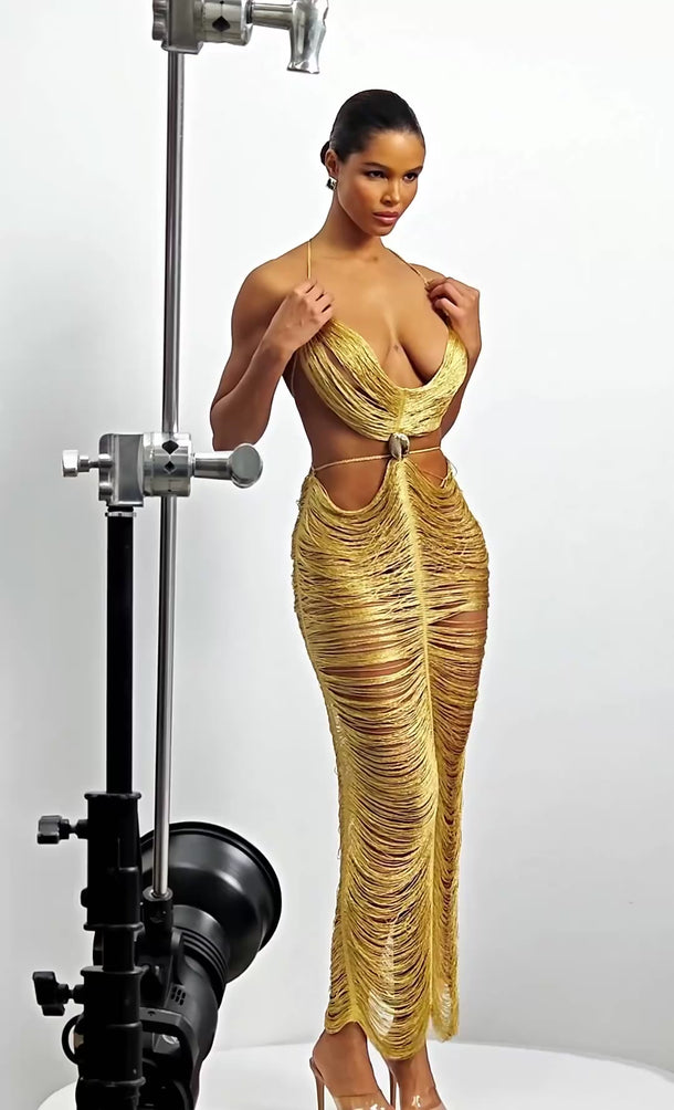 Make waves in the Mirage Drape Cover-Up Maxi Dress — a luxe beach-to-resort essential designed to captivate. With cascading metallic fringe over a sheer silhouette, bold side cutouts, and a gold-tone seashell centerpiece, this piece blurs the line between a glamorous cover-up and a daring maxi. Ideal for tropical escapes, yacht parties, or poolside nights.