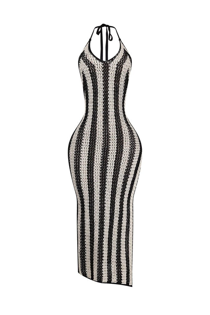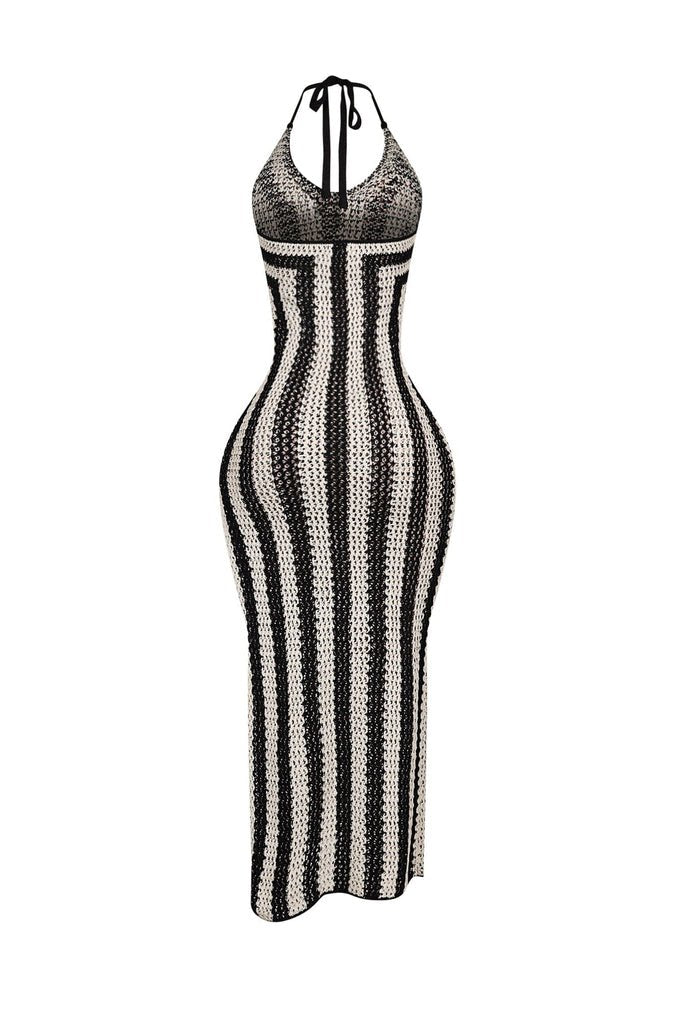 Make waves in this sultry striped crochet maxi dress, designed to hug every curve with its body-contouring silhouette and halter neckline. Featuring bold black-and-ivory open-knit stripes, a high side slit, and adjustable tie-back detail, this dress is the ultimate statement for vacation nights or rooftop soirees.