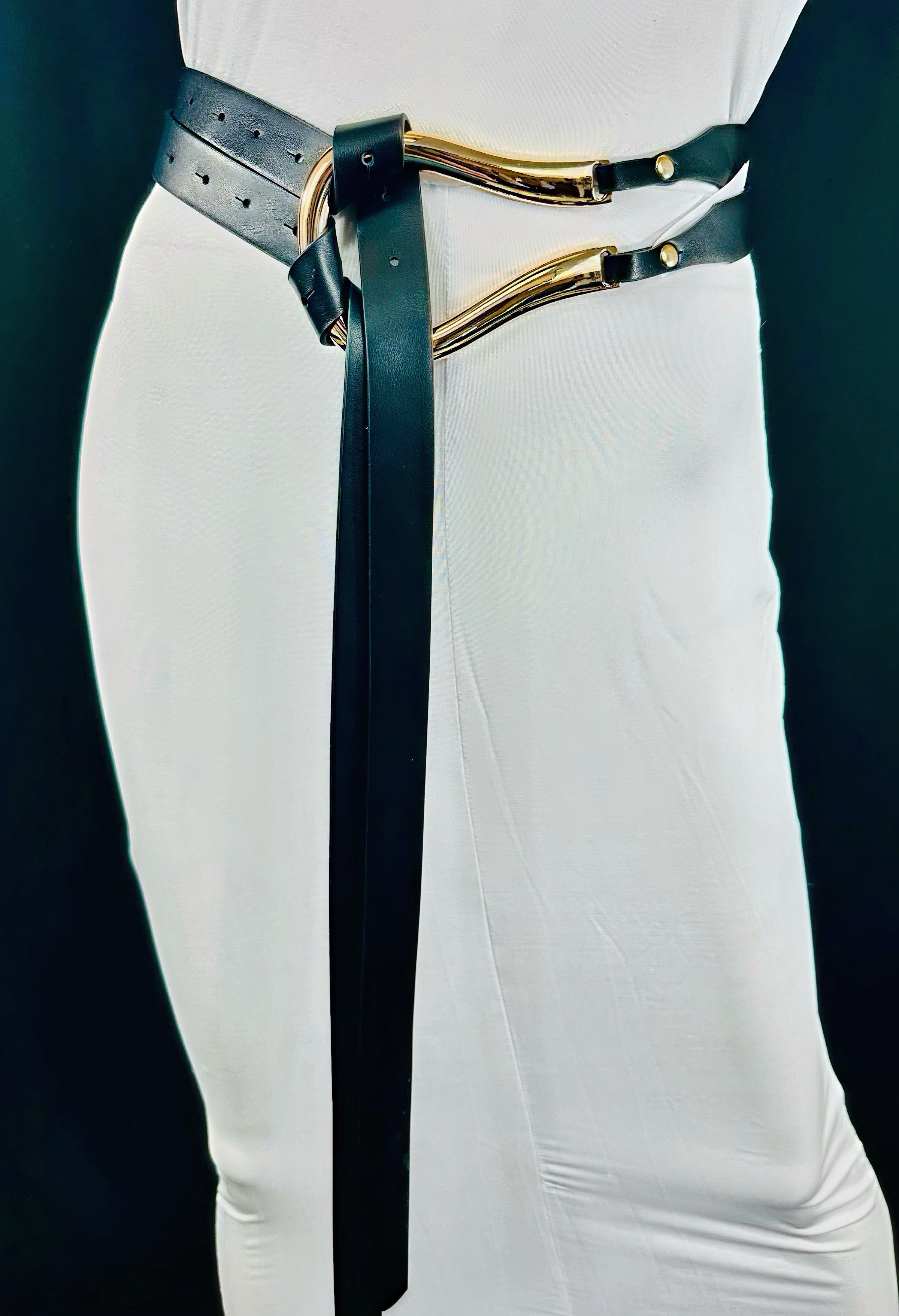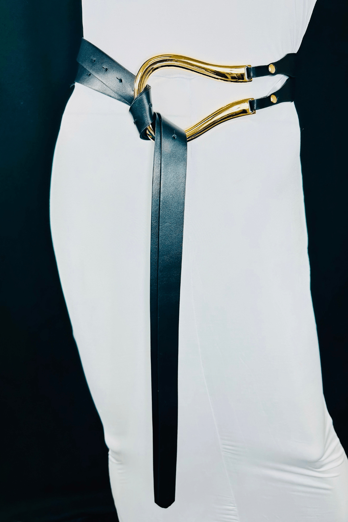The Imperial Black Waist Belt is your go-to accessory for adding bold structure and polish to any outfit. Designed with a distinctive curved silhouette and a gleaming gold metallic clasp, this belt seamlessly blends function with high fashion. Its sculptural shape adds edge to minimal looks, while the premium black fabric offers subtle stretch for comfortable wear.