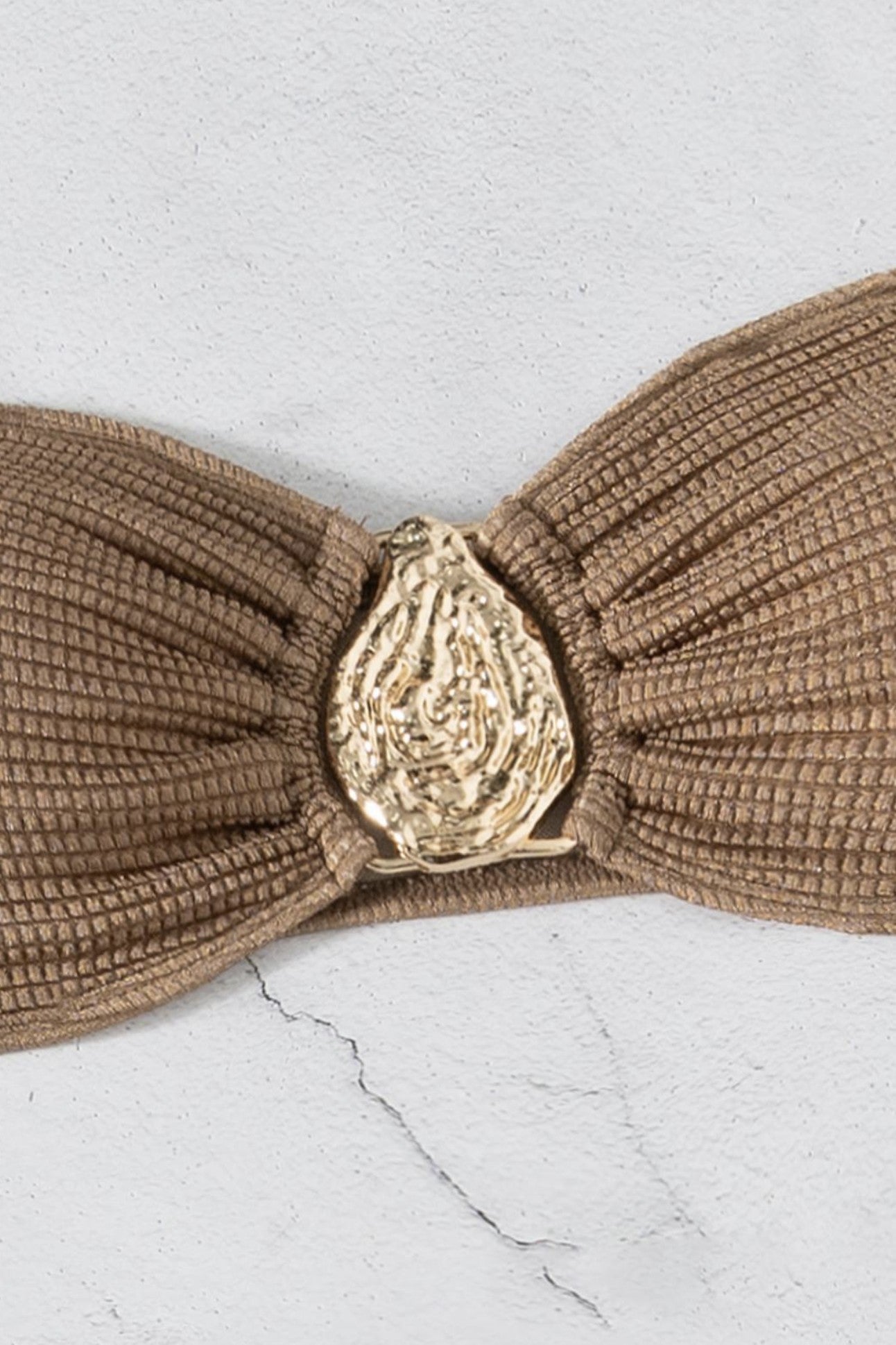 Turn heads poolside with this luxurious three-piece set featuring a textured bandeau top, high-cut bikini bottoms, and a chic mini sarong wrap. Each piece is elevated with a gold medallion detail for a touch of glam. The bandeau top is softly padded for support and comfort.
