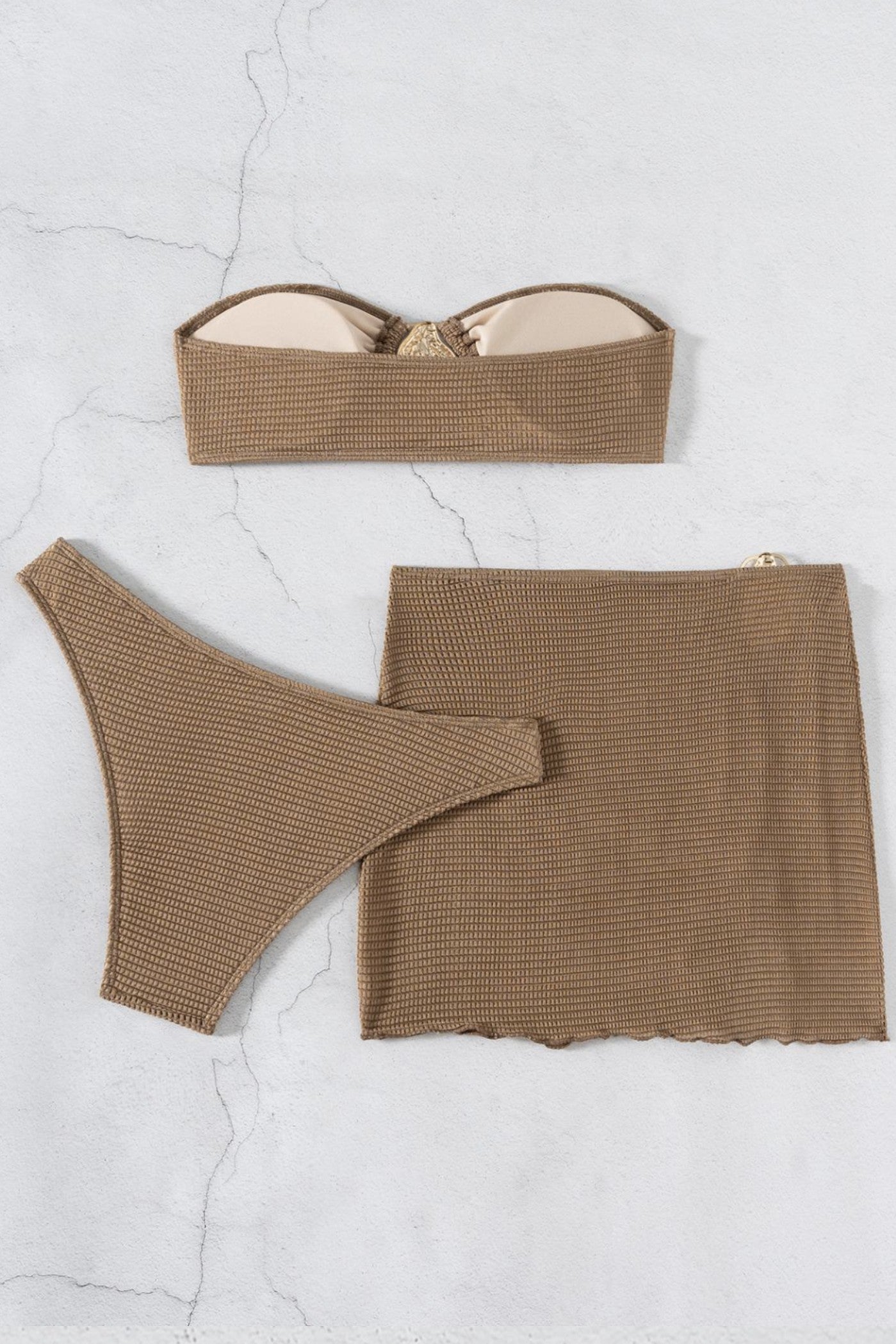 • Includes bandeau top, bottom, and mini cover-up skirt