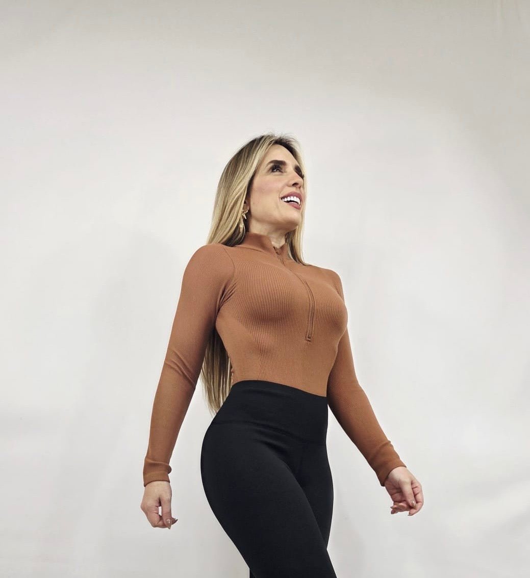 Sleek Ribbed High-Neck Bodysuit (Gingerbread)