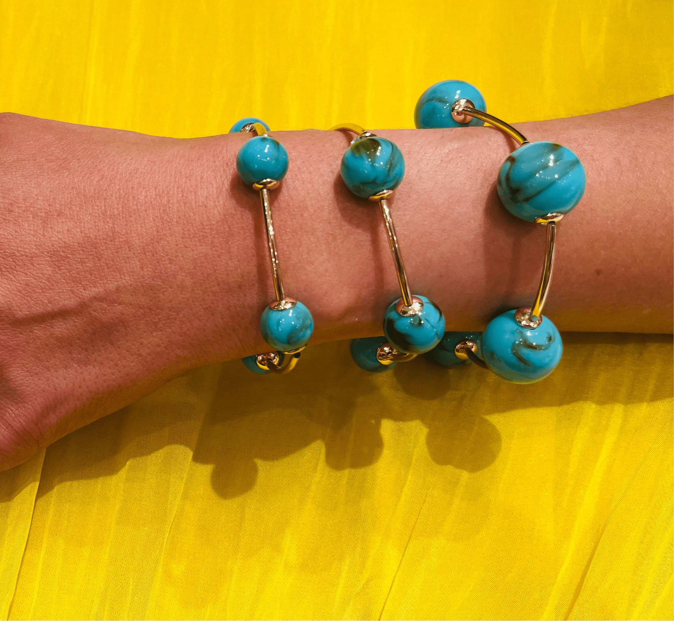 Elevate your style with this chic set of three bracelets. Each piece features glossy turquoise beads paired with a sleek gold-tone structure, creating a modern and sophisticated accessory you can wear together or separately.