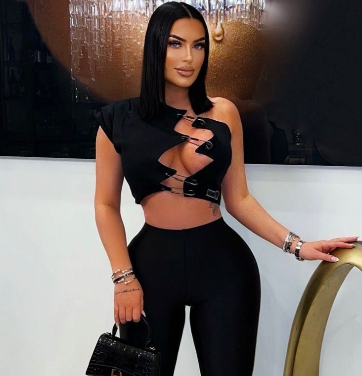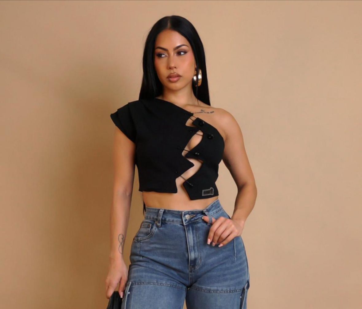 Make a bold statement with this asymmetrical crop top featuring a striking cut-out design secured by oversized metal safety hooks. With one-shoulder styling and a sleek fit, this top is perfect for turning up the heat day or night. A full back zipper adds edge and ease.