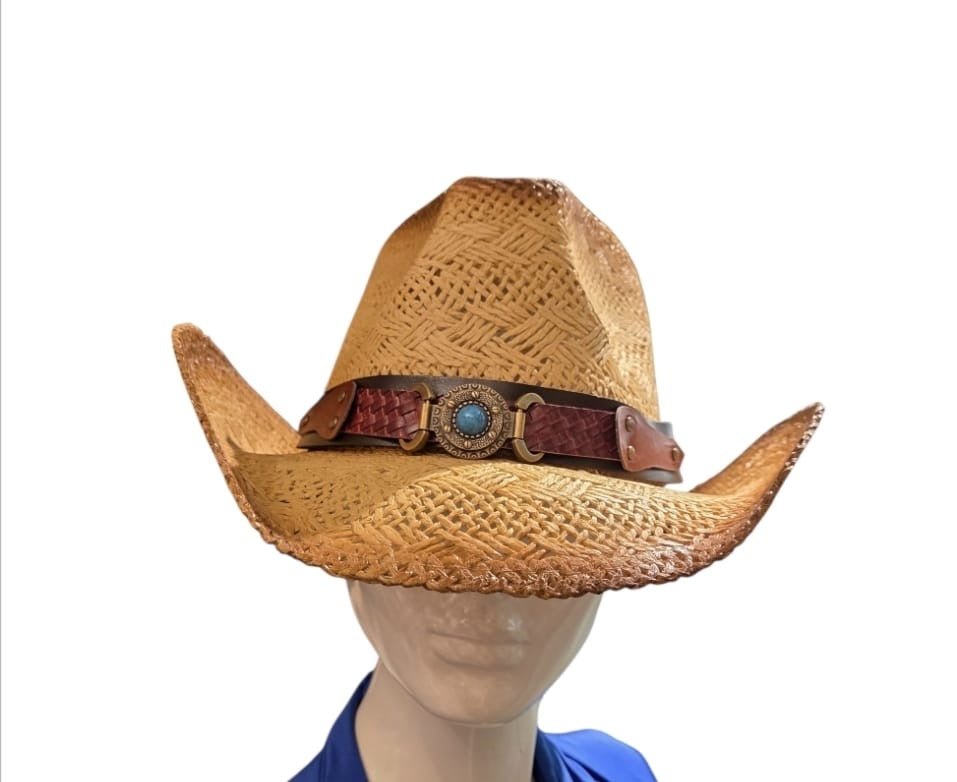 Crafted from 100% natural straw, this cowboy hat features a hand-woven pattern and a rich faux leather band with rustic braided accents and a bold turquoise centerpiece. Lightweight and breathable with Western character, it's the perfect statement piece for sunny adventures or country-chic looks