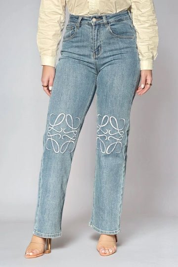 High-Rise Straight Leg Jeans with Embroidered Knee Detail