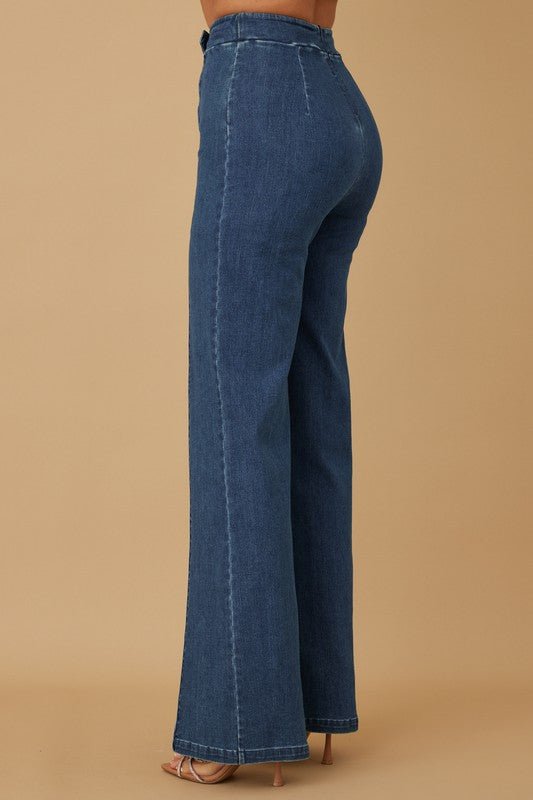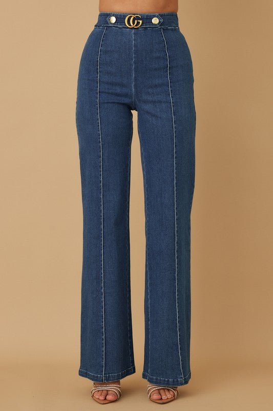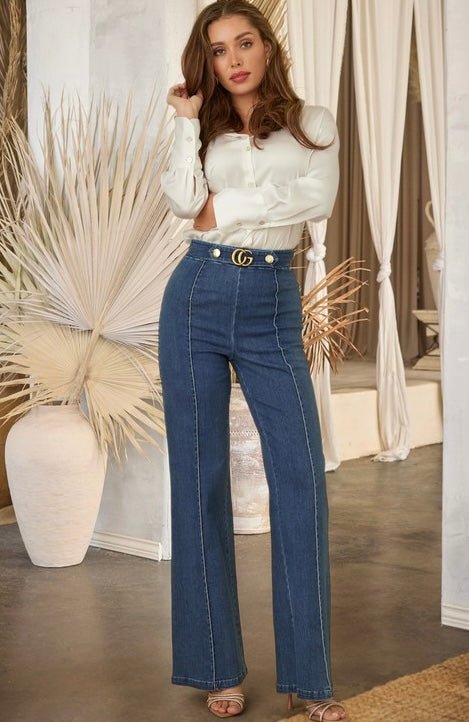 Meet the Luxe Line Sculpting Jeans — your go-to for sleek sophistication and everyday elegance. These high-waisted jeans feature tailored vertical seams that define your silhouette, while the gold-tone buttons and decorative buckle add a luxe finishing touch. The wide-leg cut elongates the legs for a flattering, confident look you can dress up or down.