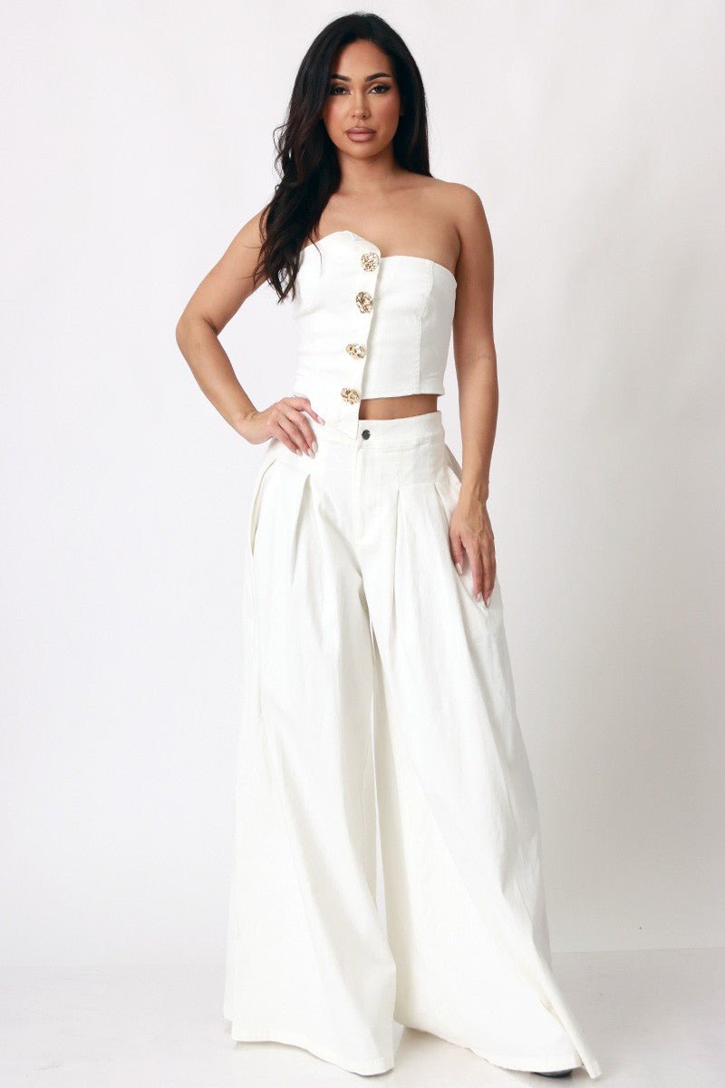 Luxe Denim Smocked Tube Top & Wide-Leg Pants Set- white