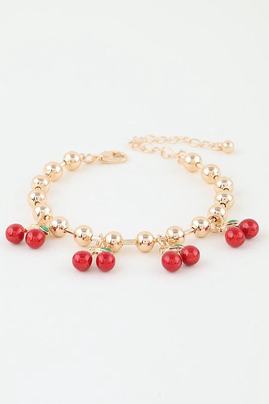 Add a playful twist to your look with the Cherry Pop Charm Bracelet. Featuring glossy cherry charms and shiny gold-tone beads, this statement bracelet delivers a fun and flirty vibe. The cherry details are accented with small green leaves for a touch of whimsy, making it perfect for both date nights and music festivals. Adjustable for comfort, it pairs effortlessly with everything from a little black dress to casual denim.