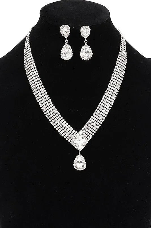 - Featuring layered rows of shimmering rhinestones that form a flattering V-shape silhouette, this set is finished with a radiant teardrop pendant for that extra touch of glam