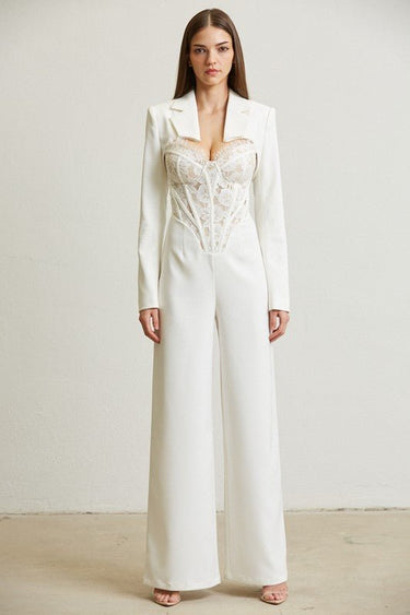 High Class Lace Trim Blazer 2 pcs Jumpsuit Set (white)