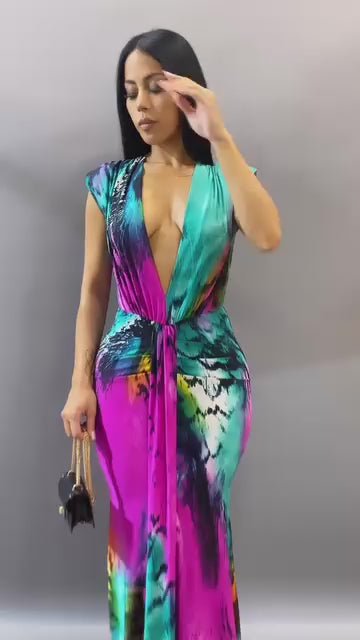 •A stunning sleeveless maxi dress adorned with a bold abstract print. The dress features vivid hues of aqua, pink, and blue, reminiscent of flames and water merging in an artistic display. It is designed with a cinched twist at the waist, creating an elegant and slimming effect, leading to a sleek, floor-length skirt.