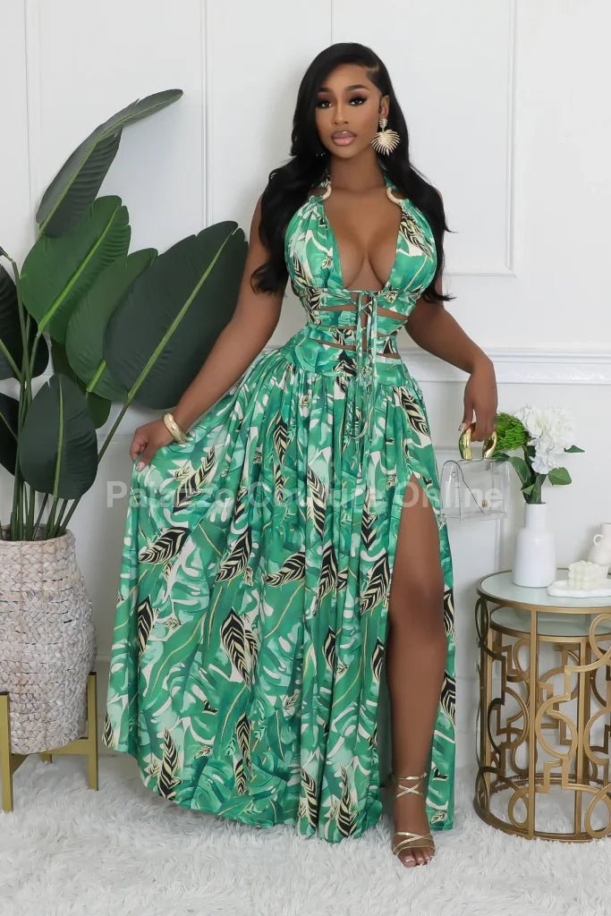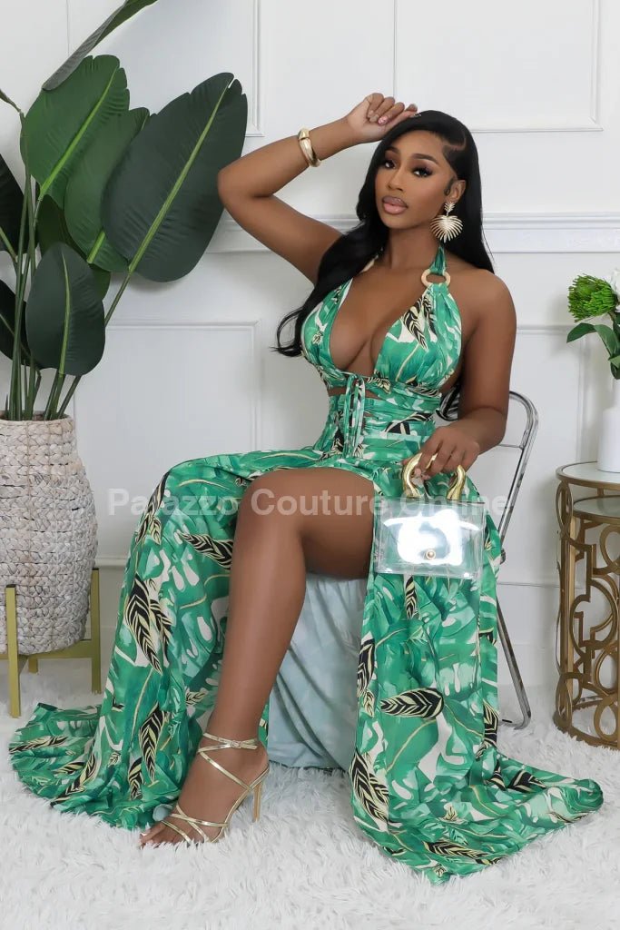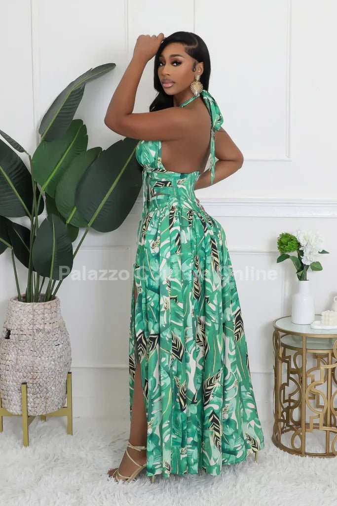 Embrace the essence of summer with the Tropical Allure Cutout Summer Maxi Dress, a perfect blend of elegance and boldness. This striking dress features a vibrant tropical leaf print woven fabric that evokes the lush beauty of an island paradise. The summer dress style is enhanced by a halter neck with O-ring trim, bra padding, and adjustable string cutout details, adding a touch of allure. The flowing maxi skirt, complemented by a front leg slit, ensures a graceful and breezy silhouette. An invisible zipper back provides a seamless finish. Crafted from 100% polyester, this dress is lightweight and breathable, making it ideal for beach vacations, summer parties, or any occasion where you want to make a statement. Pair it with your favorite sandals and some delicate jewelry to complete the look.