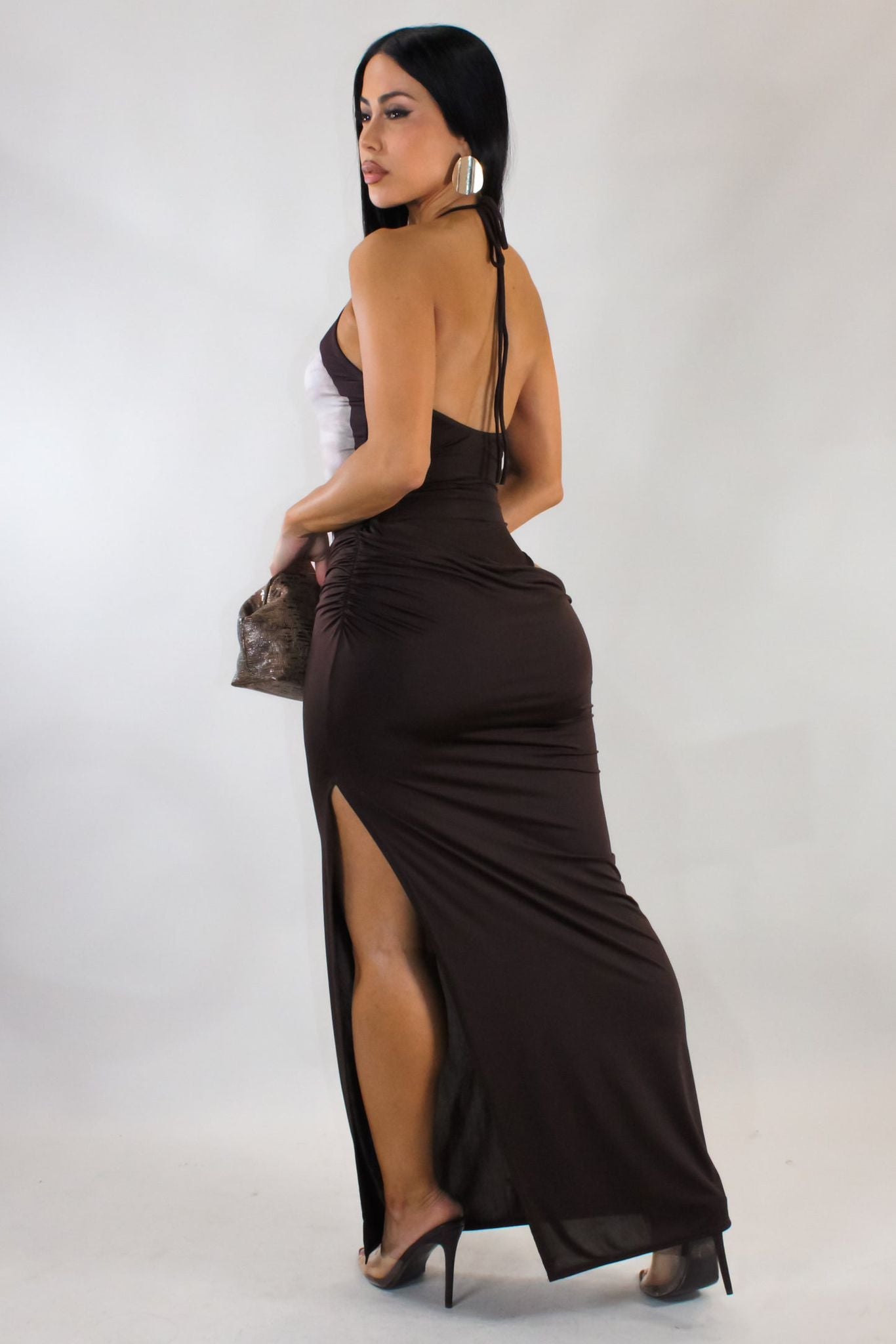• Two-piece set: halter bodysuit + maxi skirt