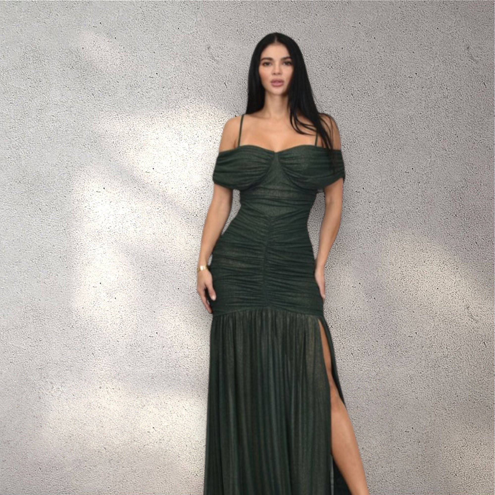Gilded Radiance Off-Shoulder Maxi Dress – Forest