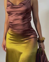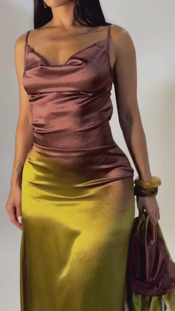 Slip into effortless glamour with this satin maxi dress, designed in a lustrous gradient finish that flows from rich tones into a radiant ombré effect. The dress features delicate spaghetti straps with a soft draped neckline, a sleek fitted bodice, and a floor-grazing silhouette that glides with every step. For added versatility, it comes with a matching satin button-down shirt that can be layered on or worn open for a chic, relaxed look.