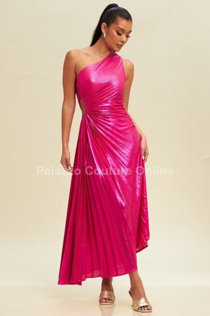 - It boasts a sleek, one-shoulder silhouette with a tasteful side cutout, wrapped in a metallic sheen. Its pleated fabric drapes gracefully, offering a touch of glamour and sophistication. This dress is a true statement piece, perfect for upscale events where making an impression is key.
