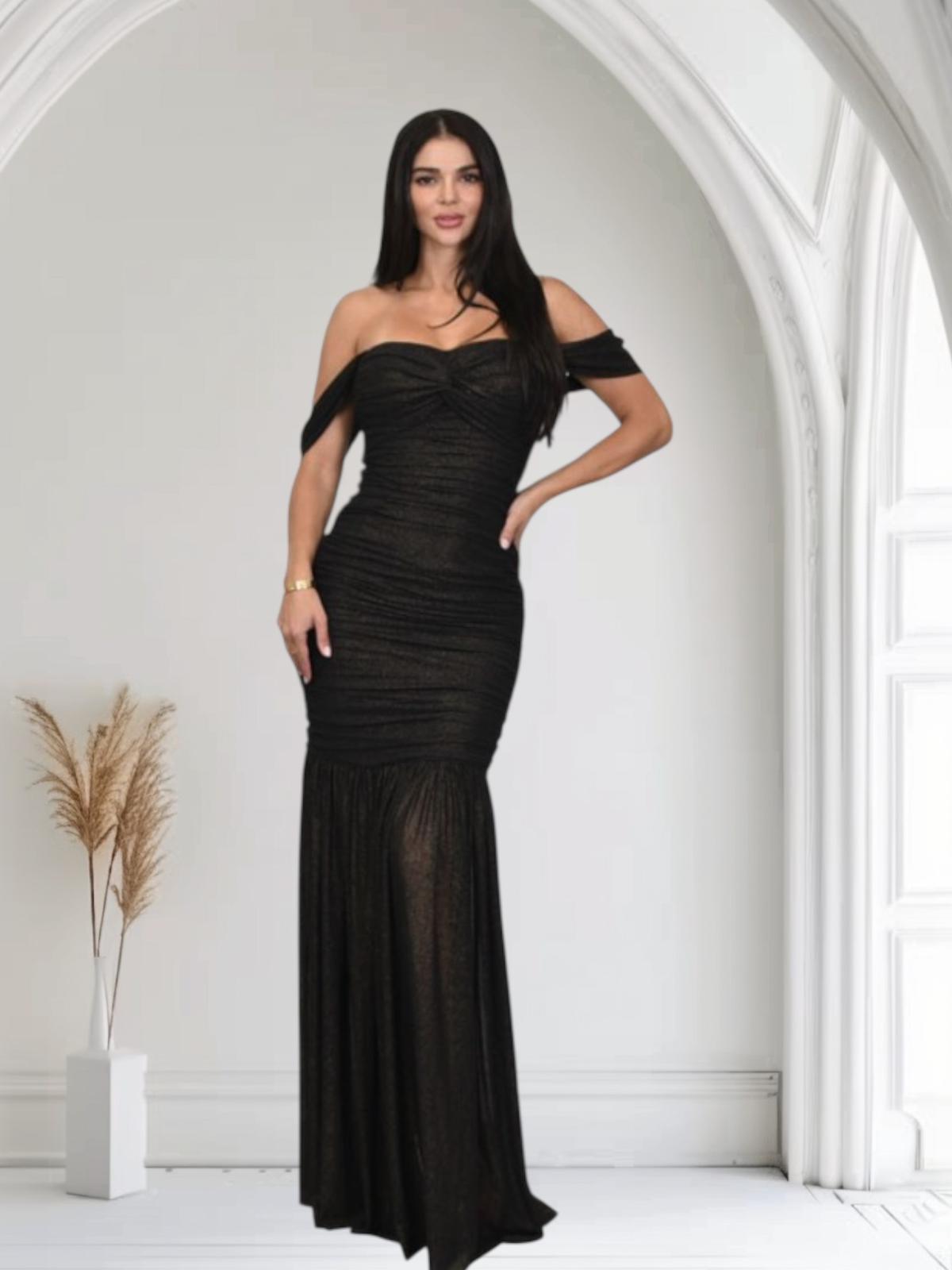 Effortlessly glamorous, the Metallic Gold Foil On Ruched Mesh Maxi Dress defines sophistication with a touch of shimmer. Crafted in a soft metallic mesh fabric with gold foil detailing, this figure-hugging silhouette features an elegant off-shoulder neckline, a twisted front accent, and flattering ruching throughout the bodice. The design flows into a beautifully flared maxi hem, creating graceful movement and elongating your shape. Perfect for galas, evening events, or weddings where timeless elegance meets modern allure.