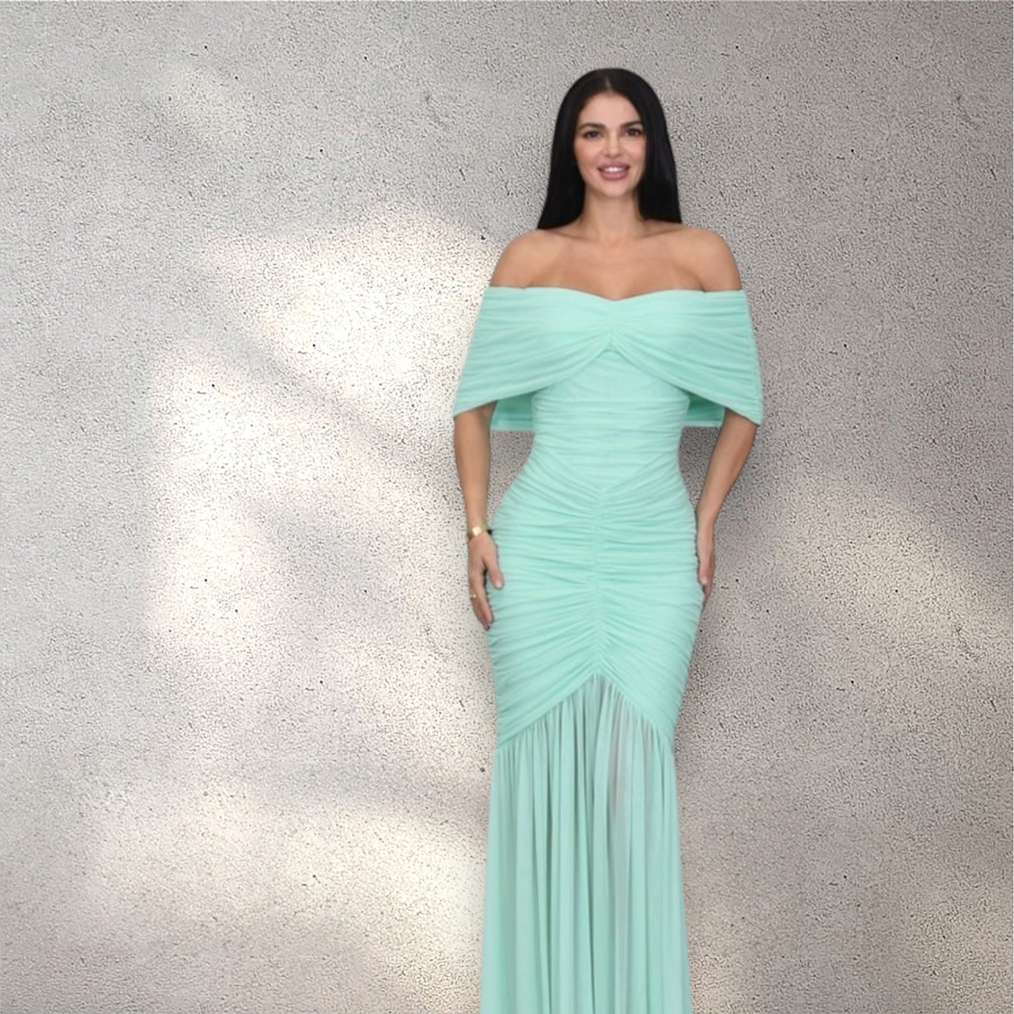 Command the room in this stunning off-shoulder gown, crafted with elegant ruching that sculpts the silhouette and flows into a dramatic sheer hemline. The slip-on design and stretch fabric ensure both comfort and sophistication—perfect for galas, red carpet moments, and high-profile events.