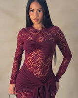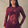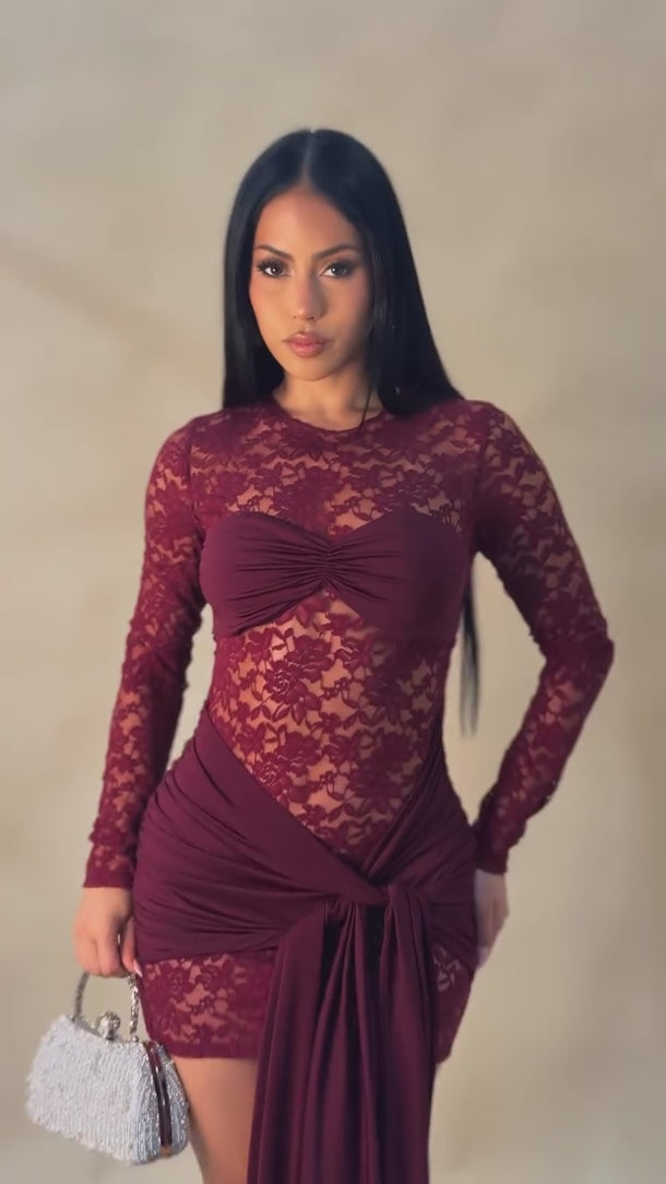 Turn heads in this sultry long-sleeve lace mini dress, featuring a sheer floral lace bodice and an elegant twist-front bandeau detail. Designed with a draped waist sash that cascades down one leg, it sculpts your curves while adding dramatic flair. Perfect for upscale nights out, cocktail parties, or romantic evenings. Back zipper closure. Double-layered where needed for coverage.