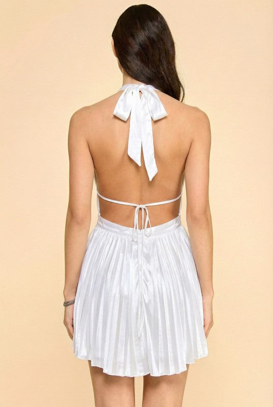 A soft, feminine statement designed to captivate effortlessly. This halter mini dress features a plunging low V neckline with delicate gathered detailing that enhances the silhouette, while the open back adds a bold yet elegant touch. The flowy pleated skirt creates beautiful movement, giving this piece a light, ethereal finish perfect for any elevated occasion.