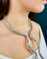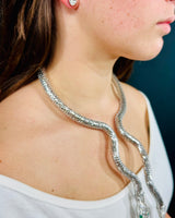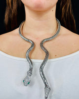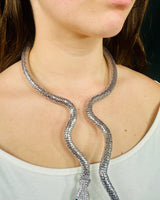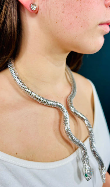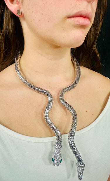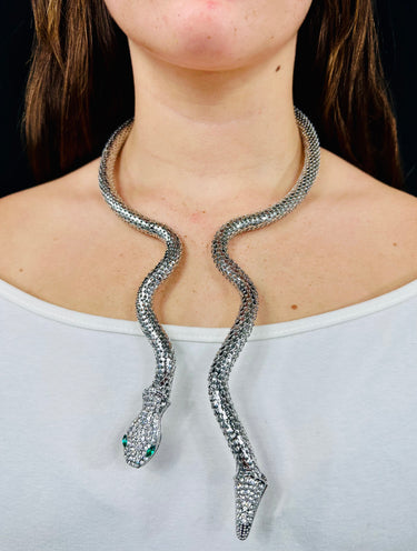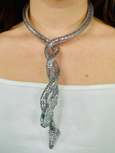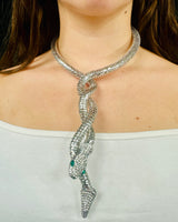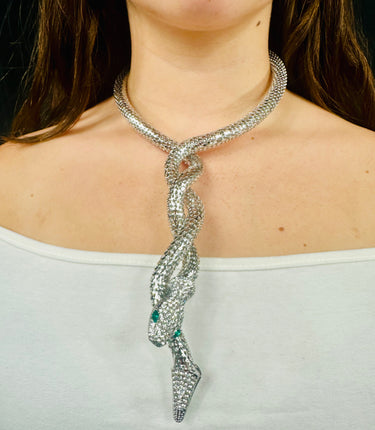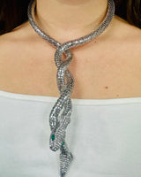 Elevate your style with the Serpentine Crystal Necklace Set. This stunning piece features a striking serpentine design, resembling a snake coiled elegantly around your neck. Crafted from high-quality, shimmering crystals, this necklace radiates luxury and sophistication. The intricate details of the snake's head and tail, adorned with green gem-like stones for the eyes, add a realistic and exotic touch. Designed to fit snugly and comfortably, this choker makes a bold fashion statement, perfect for adding a touch of glamour to any outfit.