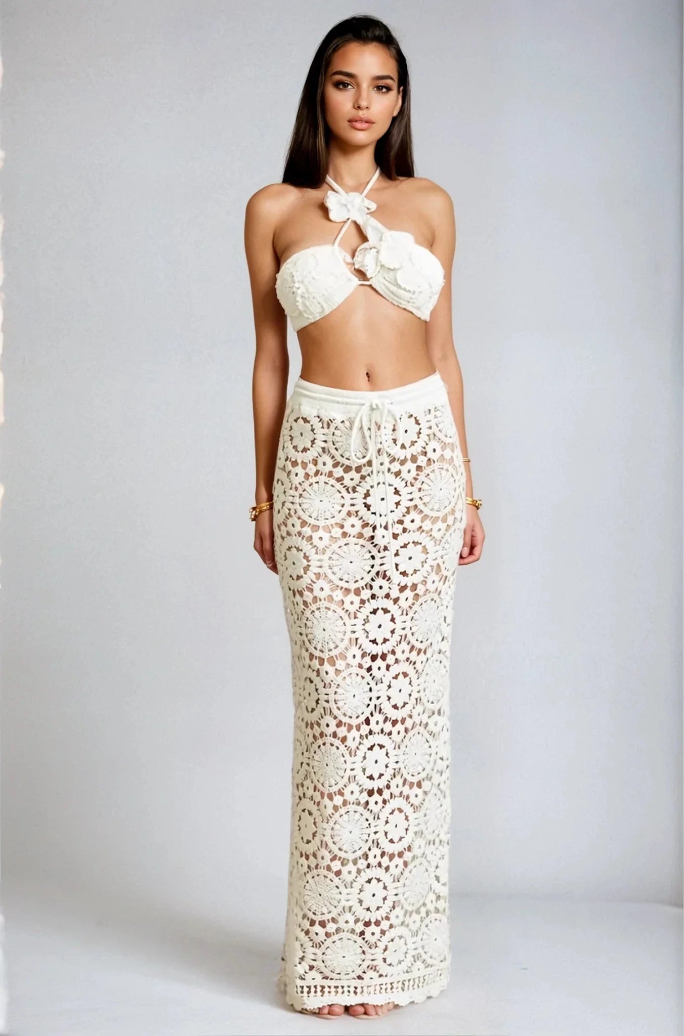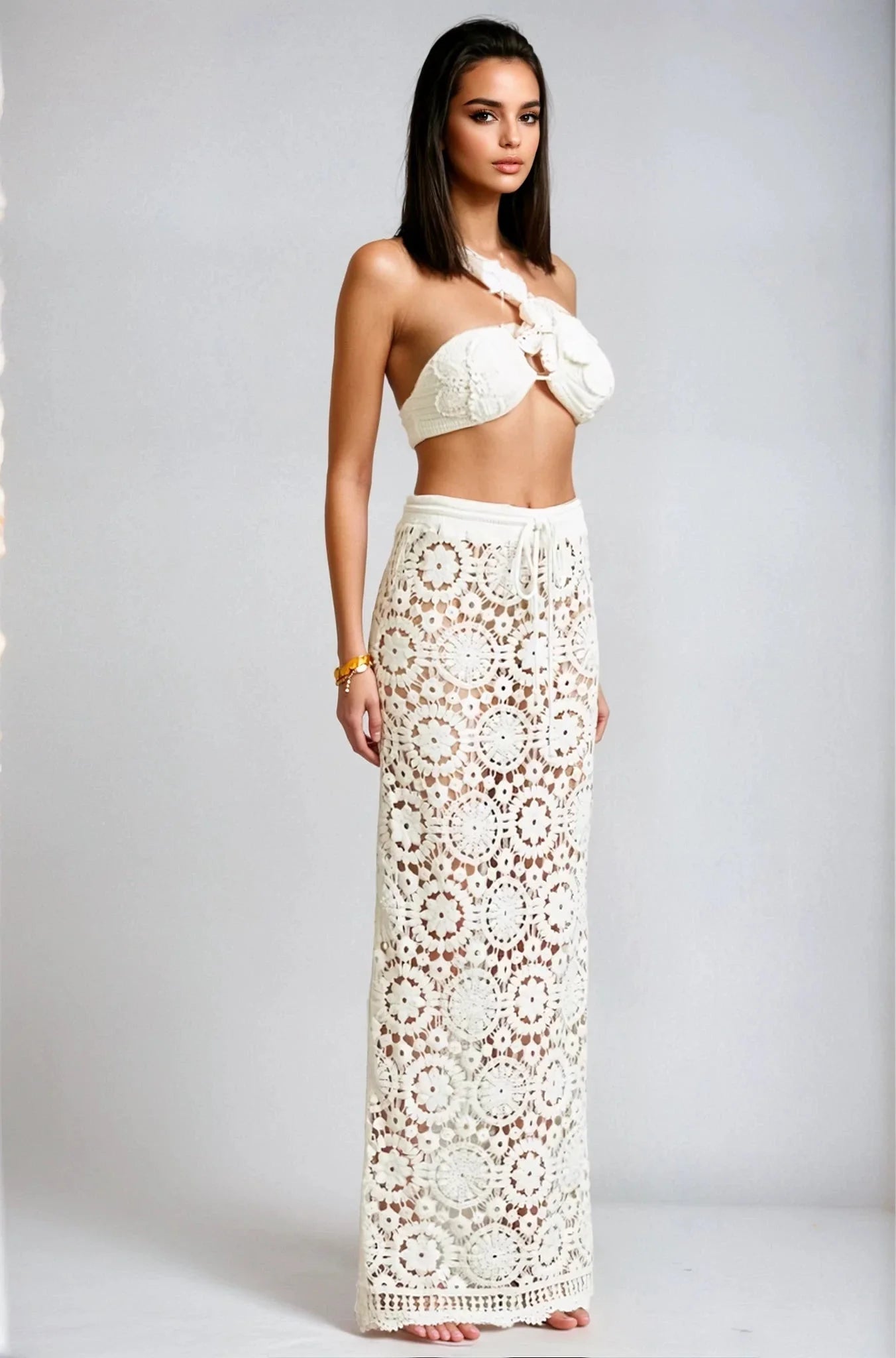 Make a statement in the Boho Bloom Crochet Skirt Set - White. This stunning two piece skirt set features intricate crochet craftsmanship with a coordinated top and skirt — a perfectly matched ensemble that delivers effortless style in one look.