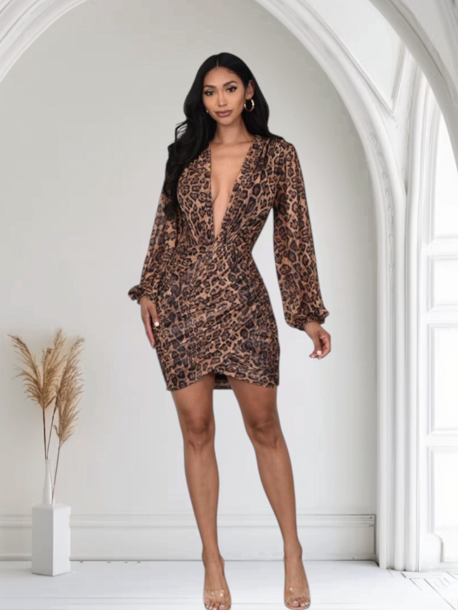 Turn heads instantly in this flawlessly sculpted mesh mini dress, designed for bold elegance and confident femininity. Featuring a dramatic deep V-neckline, long sheer sleeves, and strategic ruching that enhances every curve, this silhouette blends sophistication with irresistible edge. The soft mesh fabric offers slight stretch for comfort, making it perfect for nights out, special events, or any moment you want to stand out with effortless glamour.