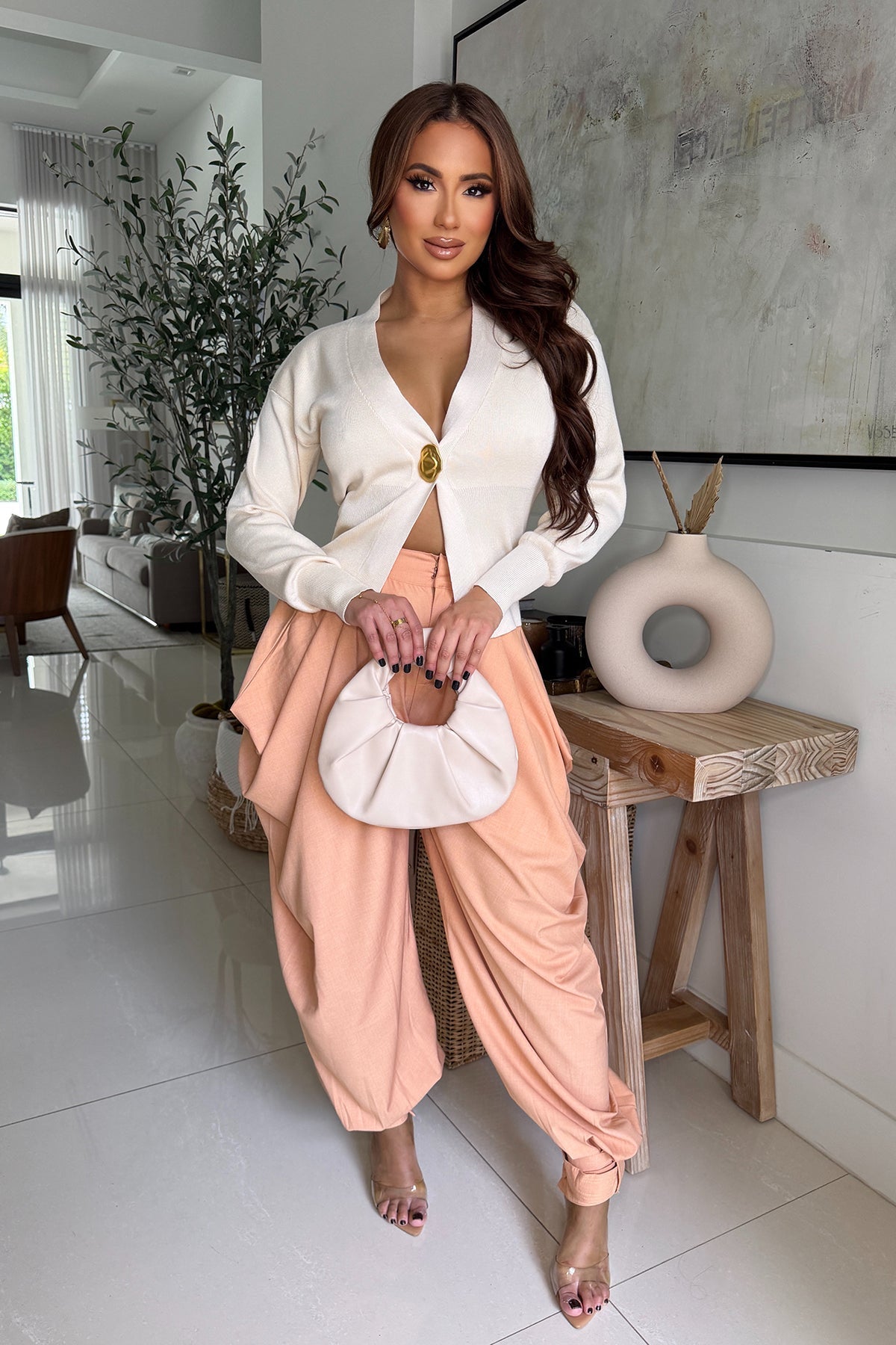 Effortless sophistication meets modern edge in the Sculpted Elegance Knit Sweater. Crafted from a smooth viscose-blend knit, this sweater features a deep V neckline with a sculptural gold statement button that cinches the waist in the most flattering way. The structured shoulders and fitted silhouette balance soft drape and shape retention, giving this piece a polished yet relaxed appeal. Perfect for styling with tailored trousers or denim, it transitions seamlessly from day chic to evening allure.