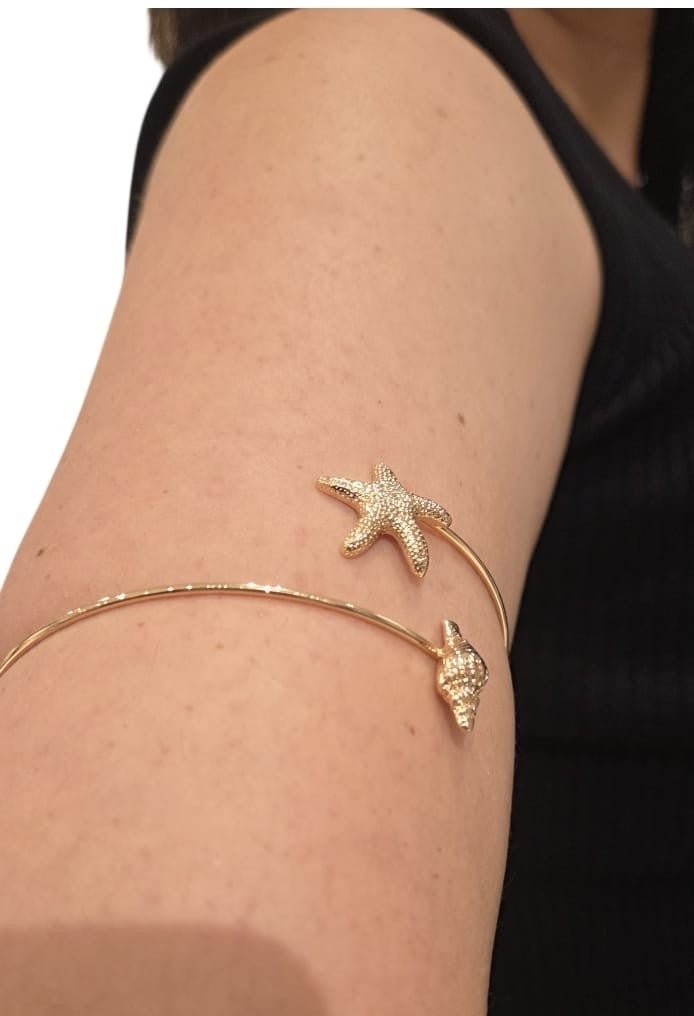 "Embrace the allure of the ocean with our Sea Whisper Cuff. This elegant open bangle features a delicately crafted starfish and a detailed seashell, both plated in radiant gold for a touch of coastal luxury. Perfect for adding a sophisticated seaside charm to any resort look or summer soirée ensemble."