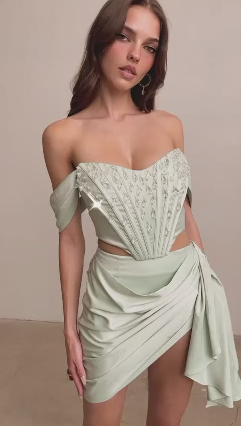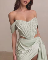 Unleash elegance with our Crystal Droplet Mint Green Corset Skirt Set—a dazzling ensemble designed to elevate your evening wardrobe. Featuring a structured corset top adorned with teardrop crystal bead detailing and a boned waist, this look embodies luxury with a touch of fairytale charm. The matte satin fabric adds a soft glow, making this piece perfect for special occasions or glamorous events.