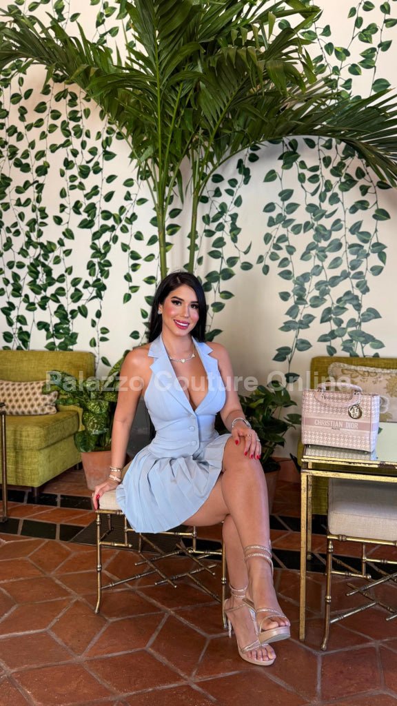 Make a bold statement with this structured pleated skirt set. Featuring a sleek halter blazer-style top with a tailored fit, it pairs effortlessly with a sharply pleated skirt for a chic, sophisticated look. The open-back design with an adjustable tie adds a flirty touch, while the skirt’s back zipper ensures a secure fit.