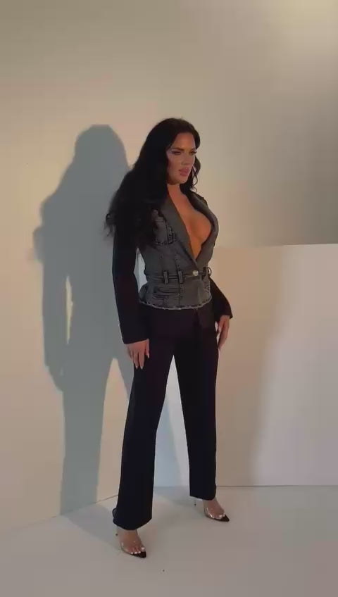 Luxe Denim Contrast Blazer & Pants Set Black Grey Wash