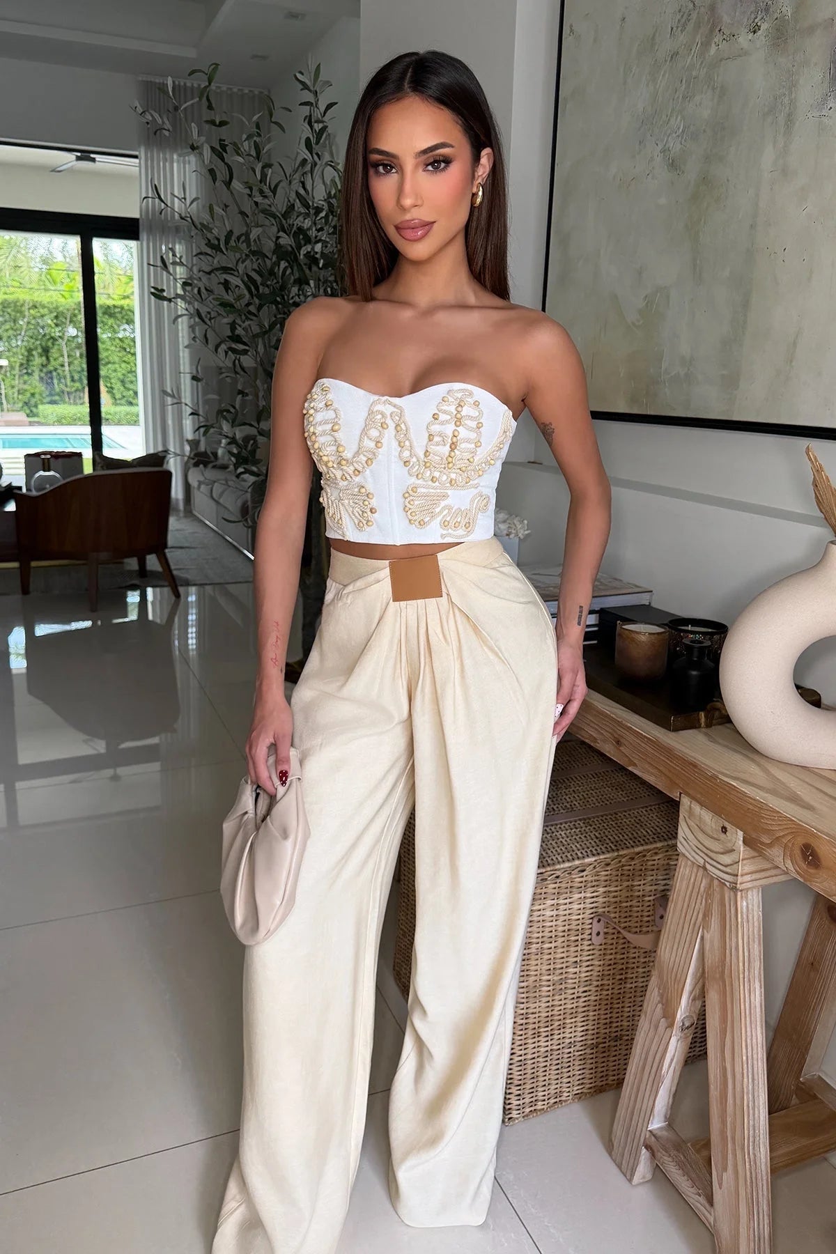 Step out in style with the Golden Hour Muse Pant Set- White/Sand. This stunning two piece pant set features premium fabric with a polished finish with a coordinated top and pants — a perfectly coordinated outfit that takes the guesswork out of looking incredible.