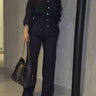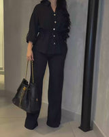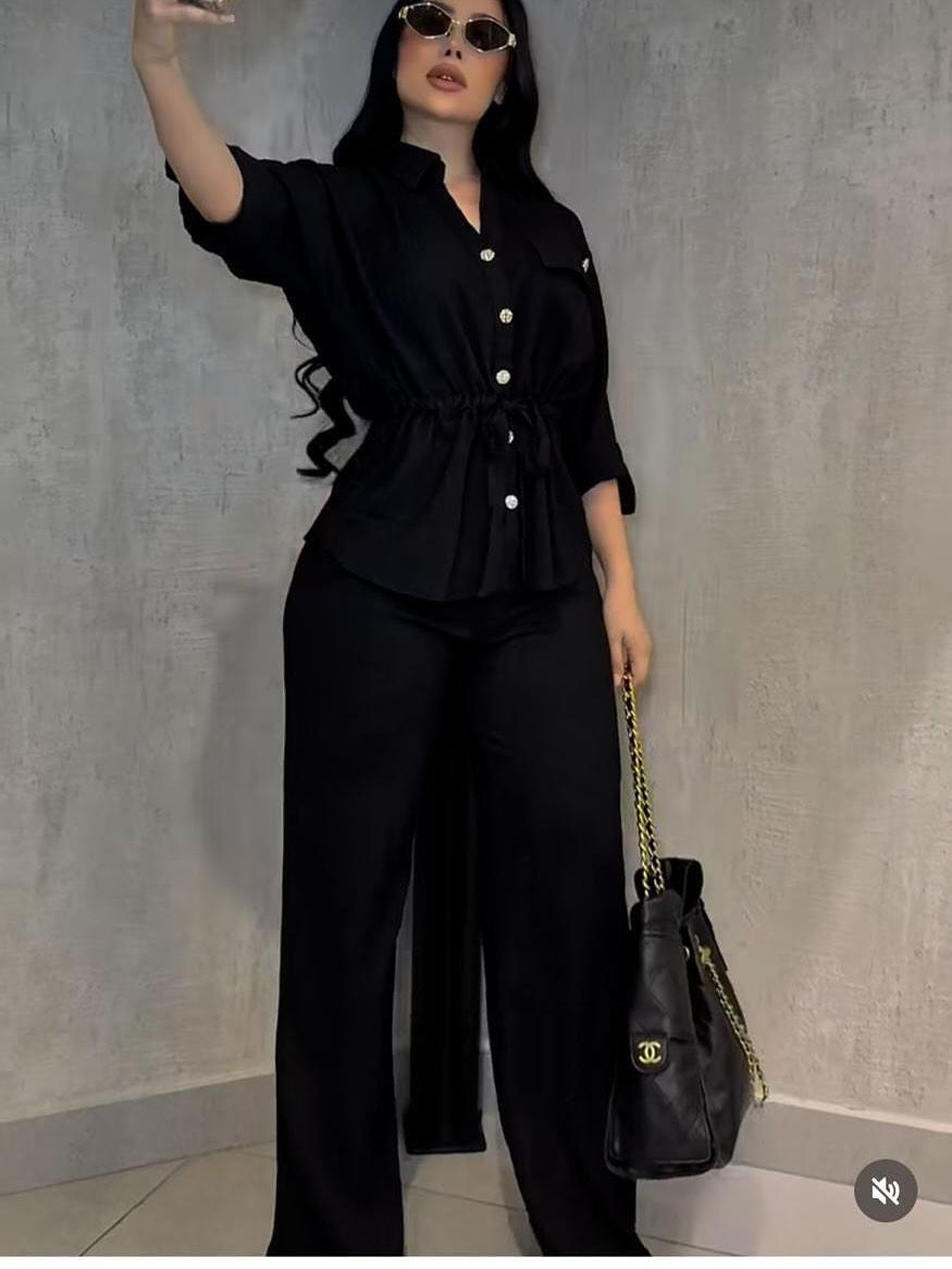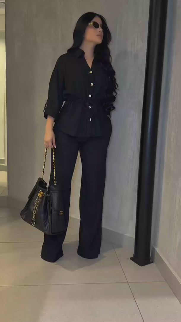 Refined and effortlessly polished, the Luxe Essence Pleated Pant Set blends comfort with sophistication. Featuring a relaxed button-up top with a drawstring waist for a tailored fit, this set moves gracefully with every step thanks to its soft pleated texture. The wide-leg pants elongate the silhouette, while the shirt’s gold-tone buttons and chest pocket add a modern, elevated touch. Perfect for travel, brunch, or evening outings — this set delivers a chic, timeless look that transitions seamlessly from day to night.