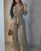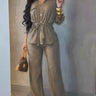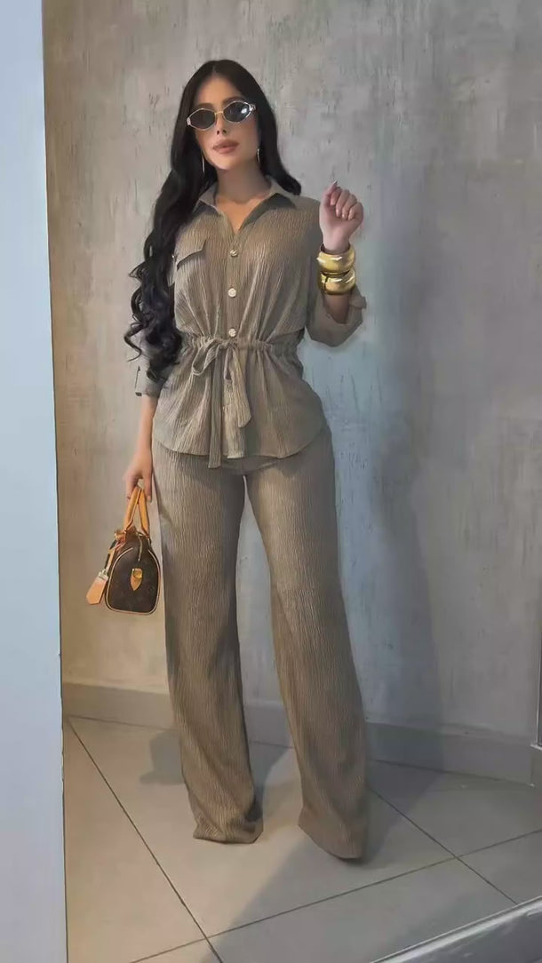 Refined and effortlessly polished, the Luxe Essence Pleated Pant Set blends comfort with sophistication. Featuring a relaxed button-up top with a drawstring waist for a tailored fit, this set moves gracefully with every step thanks to its soft pleated texture. The wide-leg pants elongate the silhouette, while the shirt’s gold-tone buttons and chest pocket add a modern, elevated touch. Perfect for travel, brunch, or evening outings — this set delivers a chic, timeless look that transitions seamlessly from day to night.