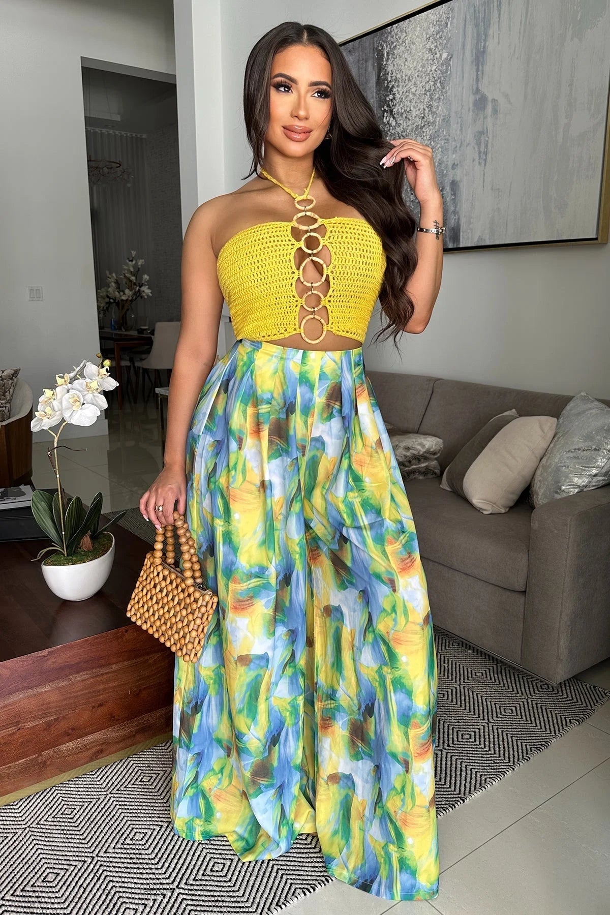 Sea Goddess 2PC Halter and Wide Leg Pant Set Yellow Multi