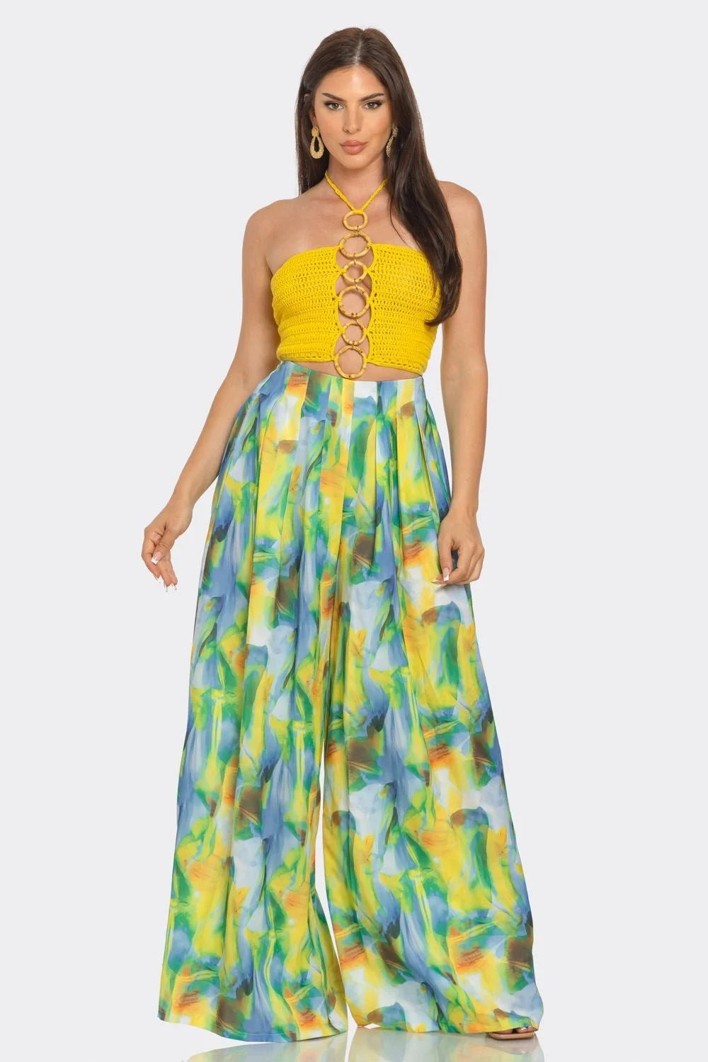 Sea Goddess 2PC Halter and Wide Leg Pant Set Yellow Multi – Women's Two Piece Pant Set