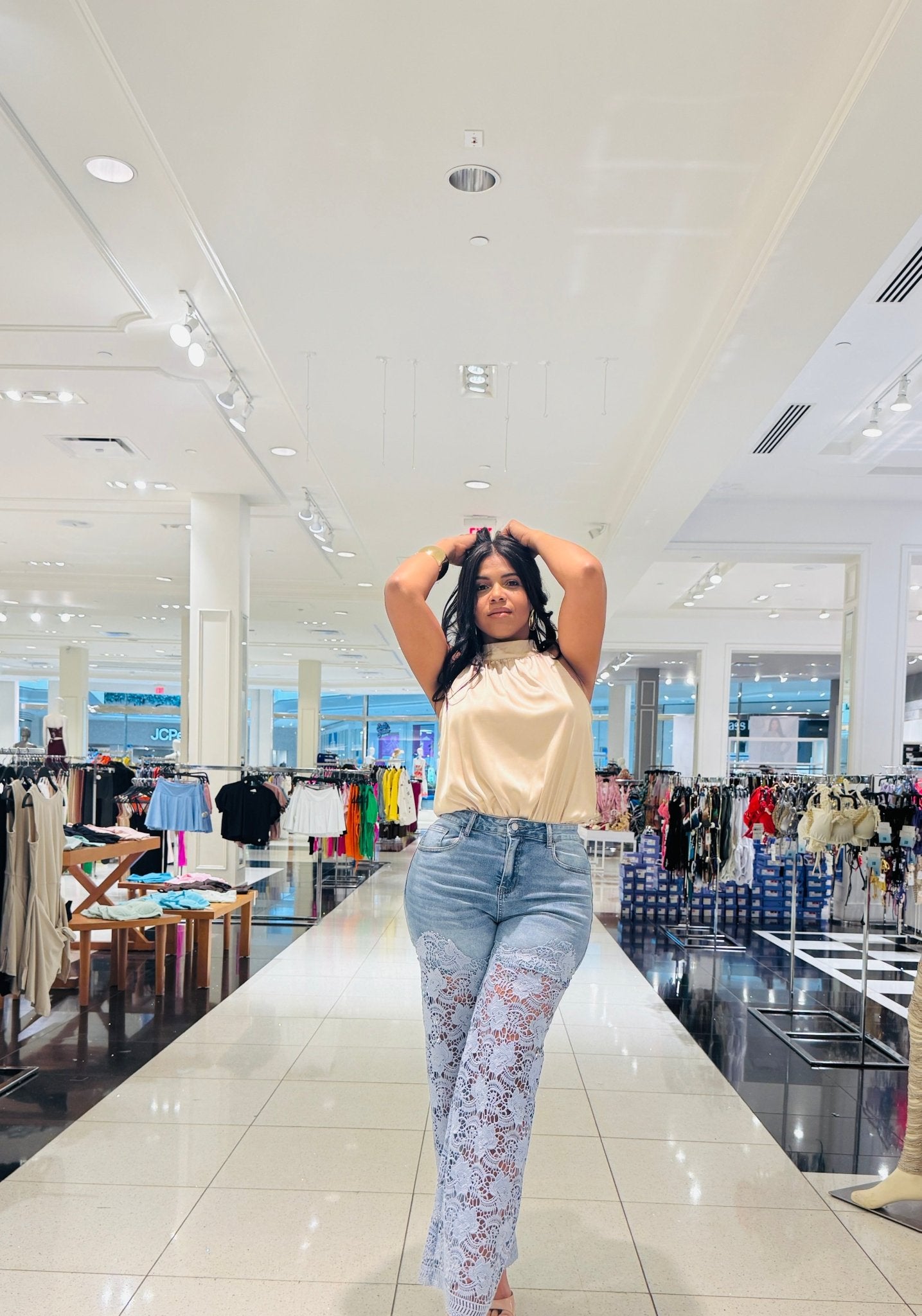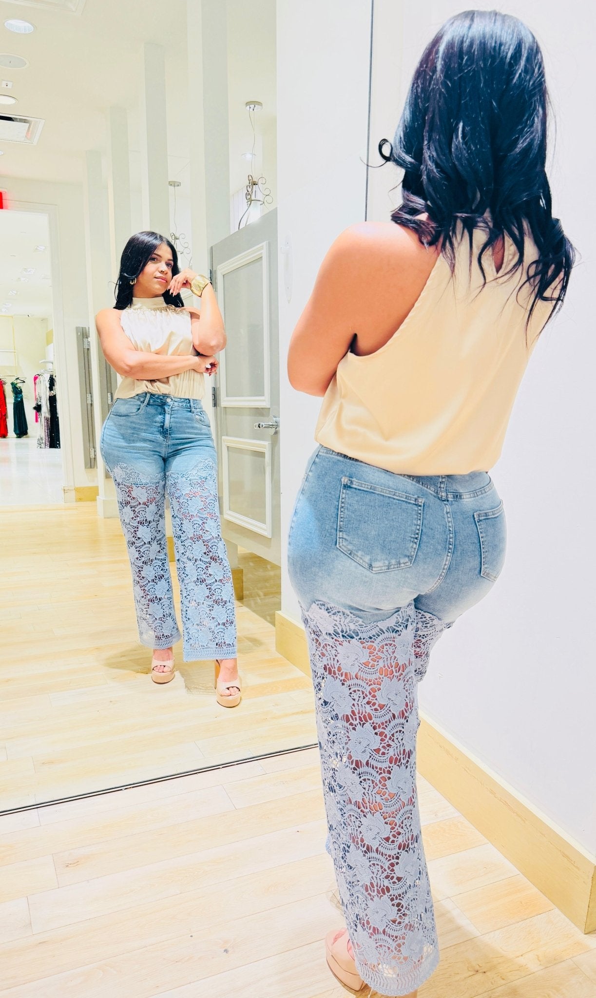 A striking fusion of classic denim and delicate lace, these high-rise straight-leg pants redefine modern femininity. Featuring sheer floral lace panels from thigh to hem, they blend edgy sophistication with romantic detail. Lightweight, breathable, and designed to flatter, they’re the ultimate statement piece for both day and evening wear.