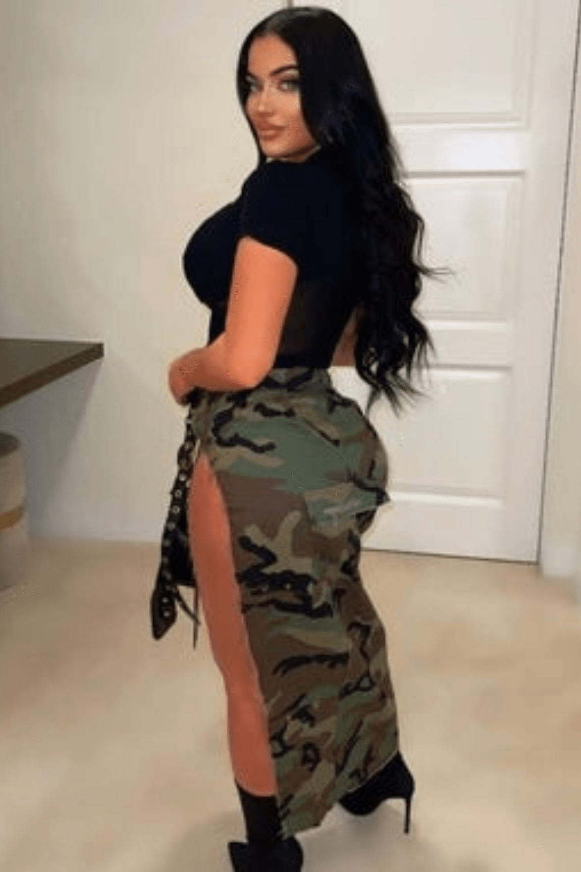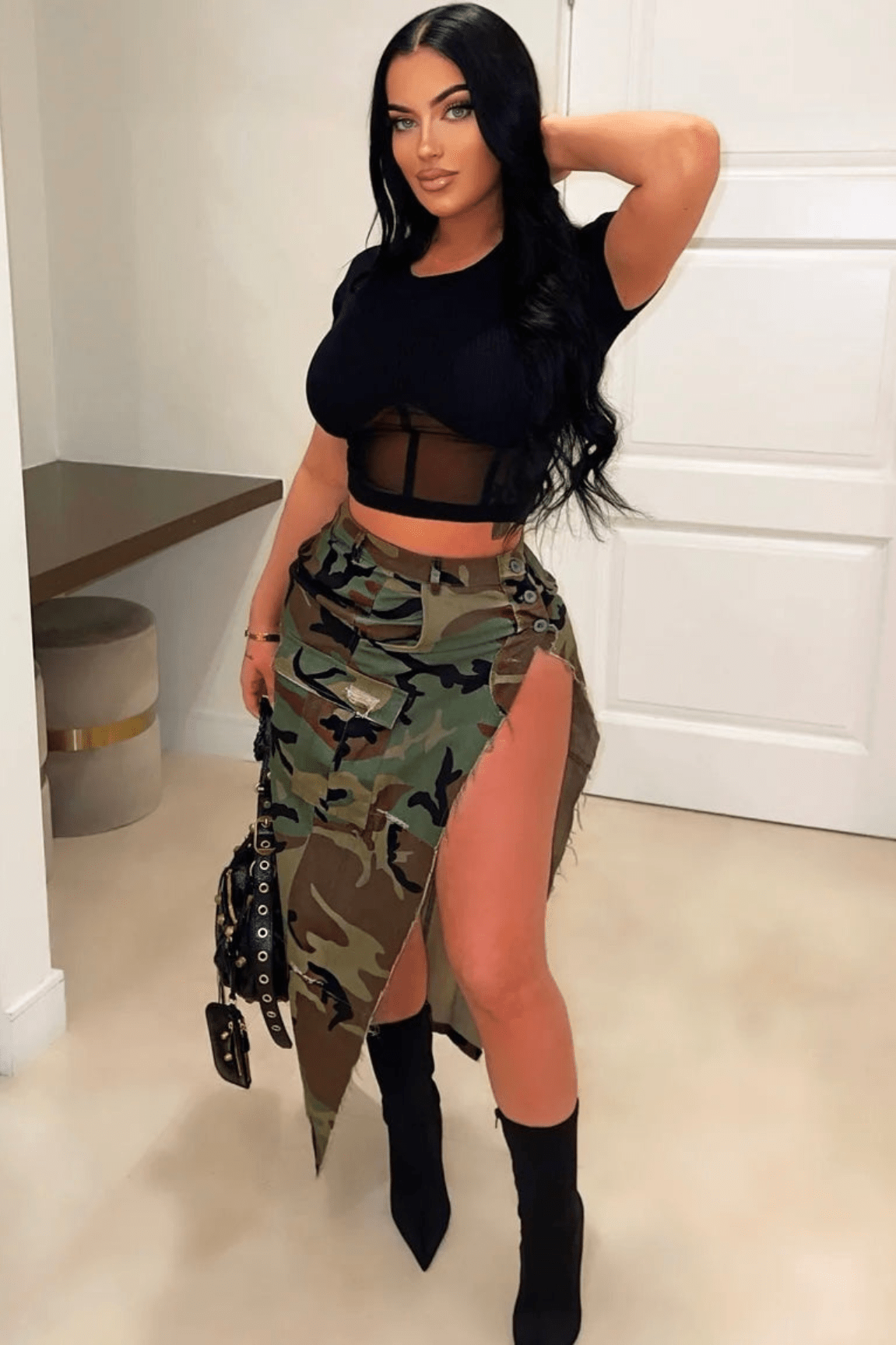 This hot high split camo skirt stretches and fits true to size. Model is wearing a small.