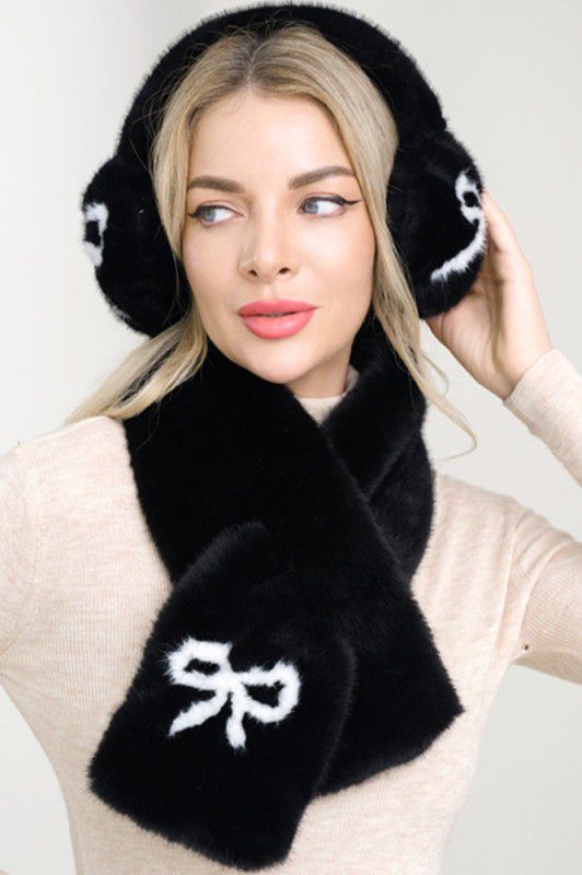 Chic Bow Fluffy Winter Scarf & Ear Muff Set - Black