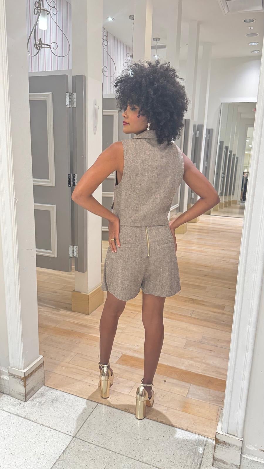 Redefine tailored elegance with this structured skort set, blending classic suiting details with a modern twist. The sleeveless vest top features a sharp lapel collar, button-front closure, and flap pockets for a polished finish. The matching skort combines the look of a mini skirt with the ease of shorts, detailed with side buckle accents and a flattering wrap effect. Perfect for day-to-night styling, this set brings sophistication and confidence to every occasion.