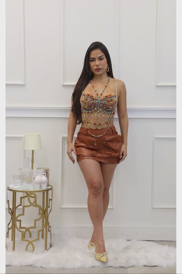 Turn every head in this couture-inspired crystal top, intricately handcrafted with cascading pearls, gold chains, and shimmering stones. Designed with a bold cut-out silhouette, no stretch, and delicate adjustable ties for a custom fit. Undergarment not included.